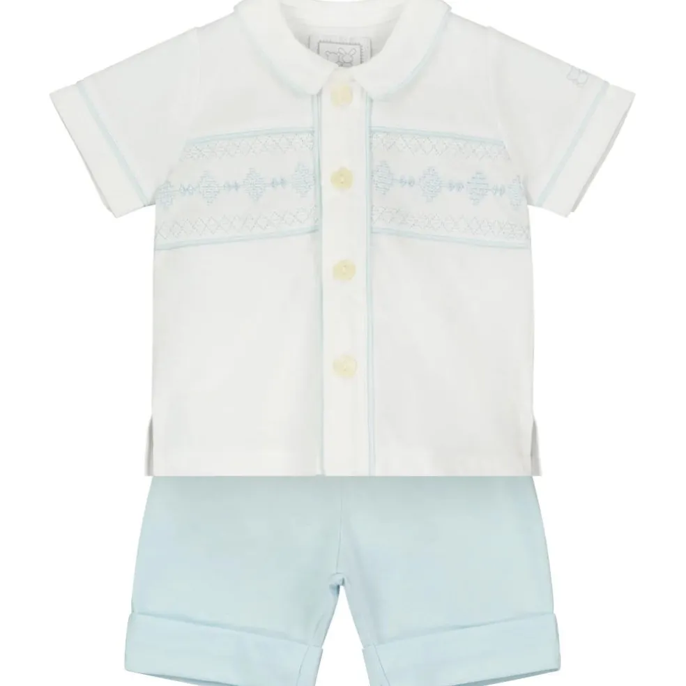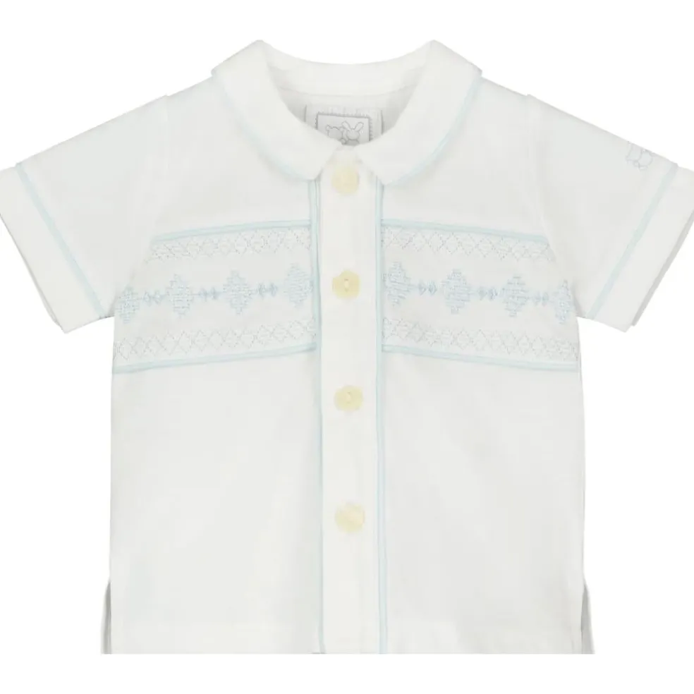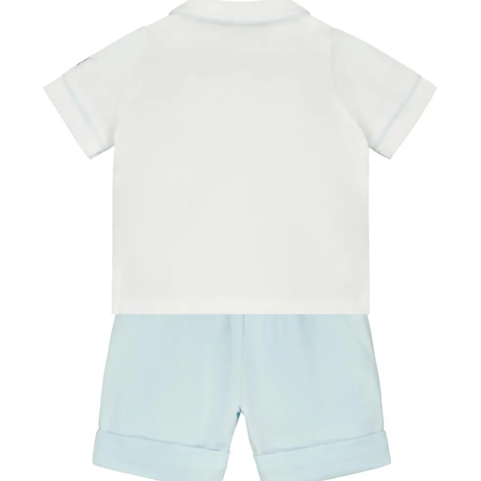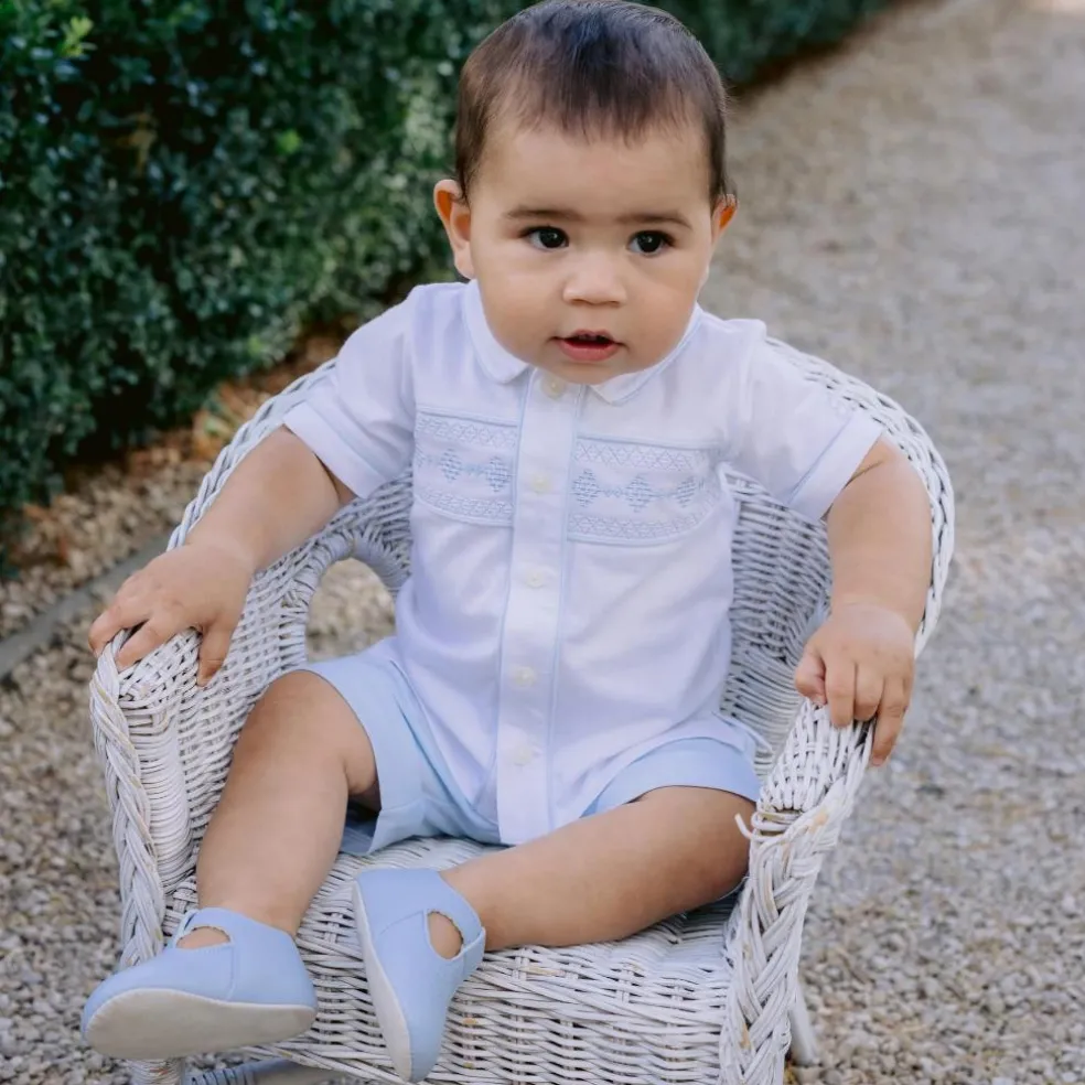 When something a little smarter is required, but still cool and comfortable for your baby boy, this two-piece is the perfect choice. On the shirt the collar, sleeves and front panels are edged in pale blue piping. An intricate diamond embroidered panel in pale blue & white lays across the chest. Teamed with pale blue shorts with smart turnups, this a perfect summer wedding outfit.