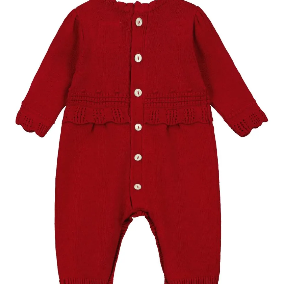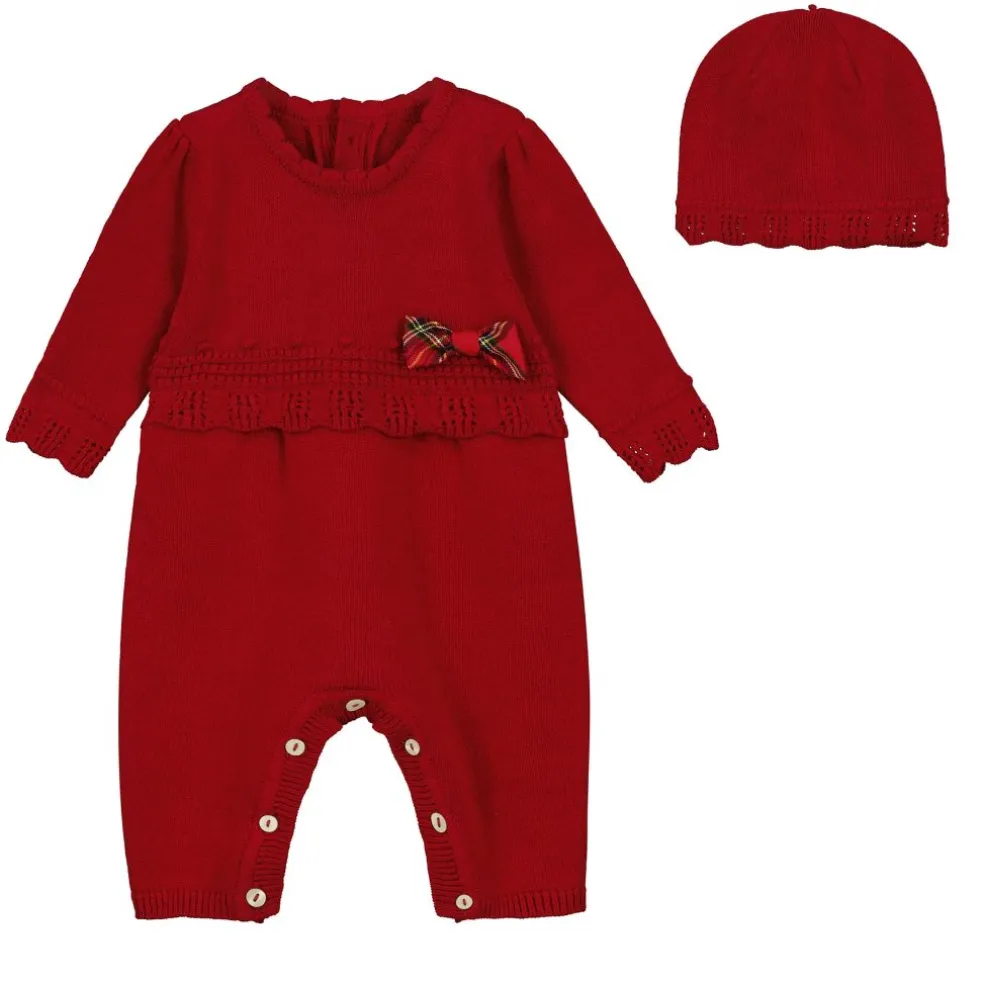 The top front panel and the sleeve edging of this beautiful red knitted all in one, are in a bobble lace pattern with a scalloped edge to the sleeves and waistline. Pearlised buttons and a tartan chest bow add additional detailing to this lovely garment. A matching knitted pull on hat completes the set. Perfect for festive winter gatherings!