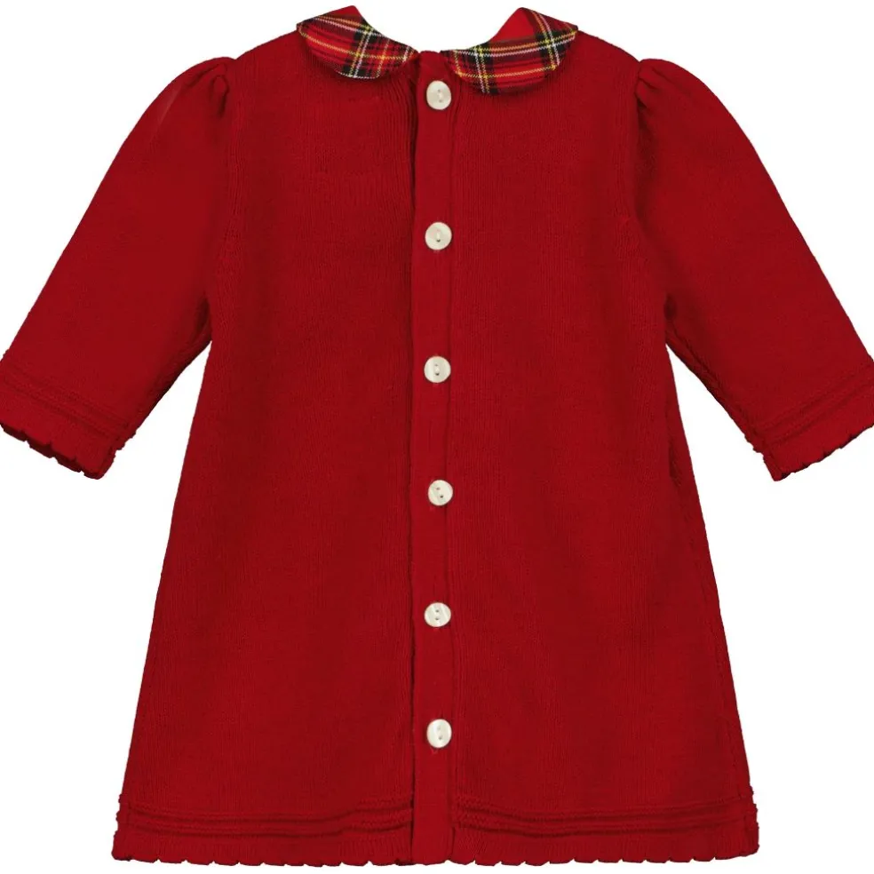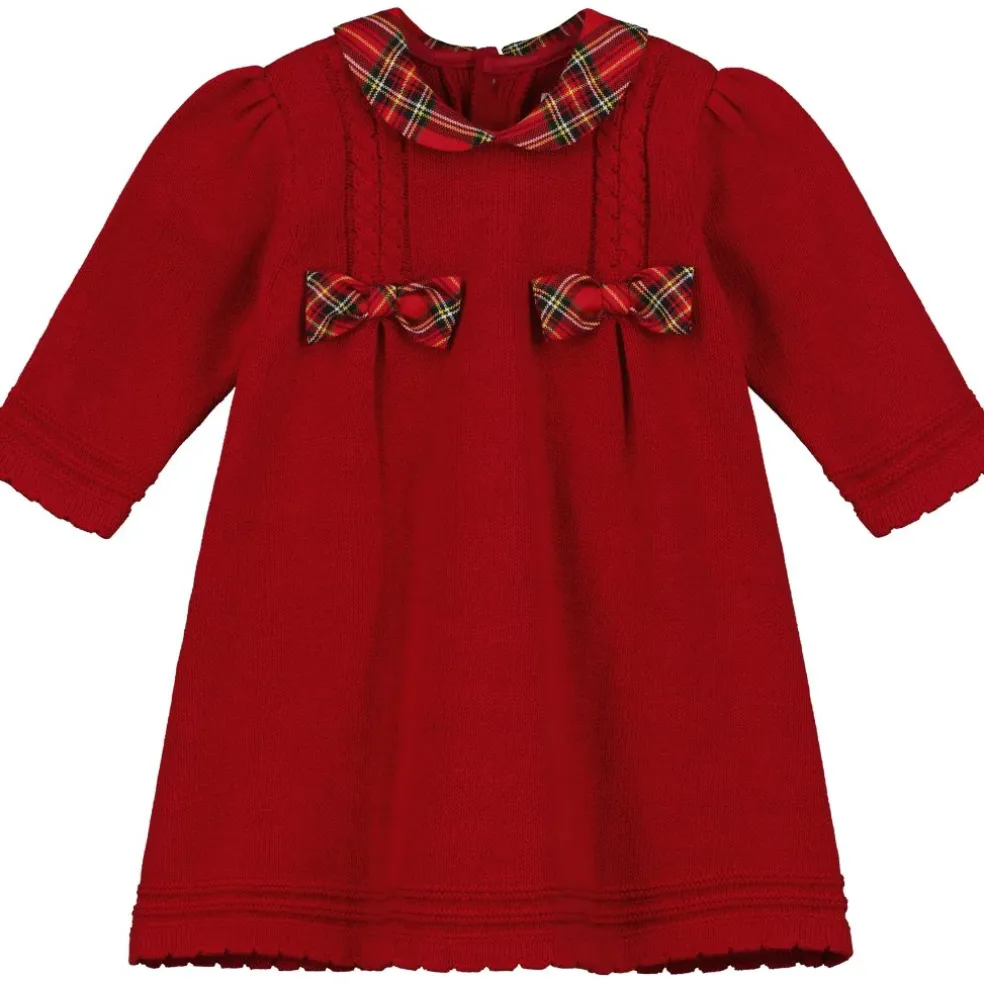 A new addition to our festive favourites, this knitted dress is simply stunning! Beautiful cable knit detailing run vertically from each shoulder and are finished off with tartan bows. Lace effect scallop edges to the sleeves and hemline give texture, and the contrasting rounded tartan collar finishes off this perfect dress for a Christmas or Winter festive party!
