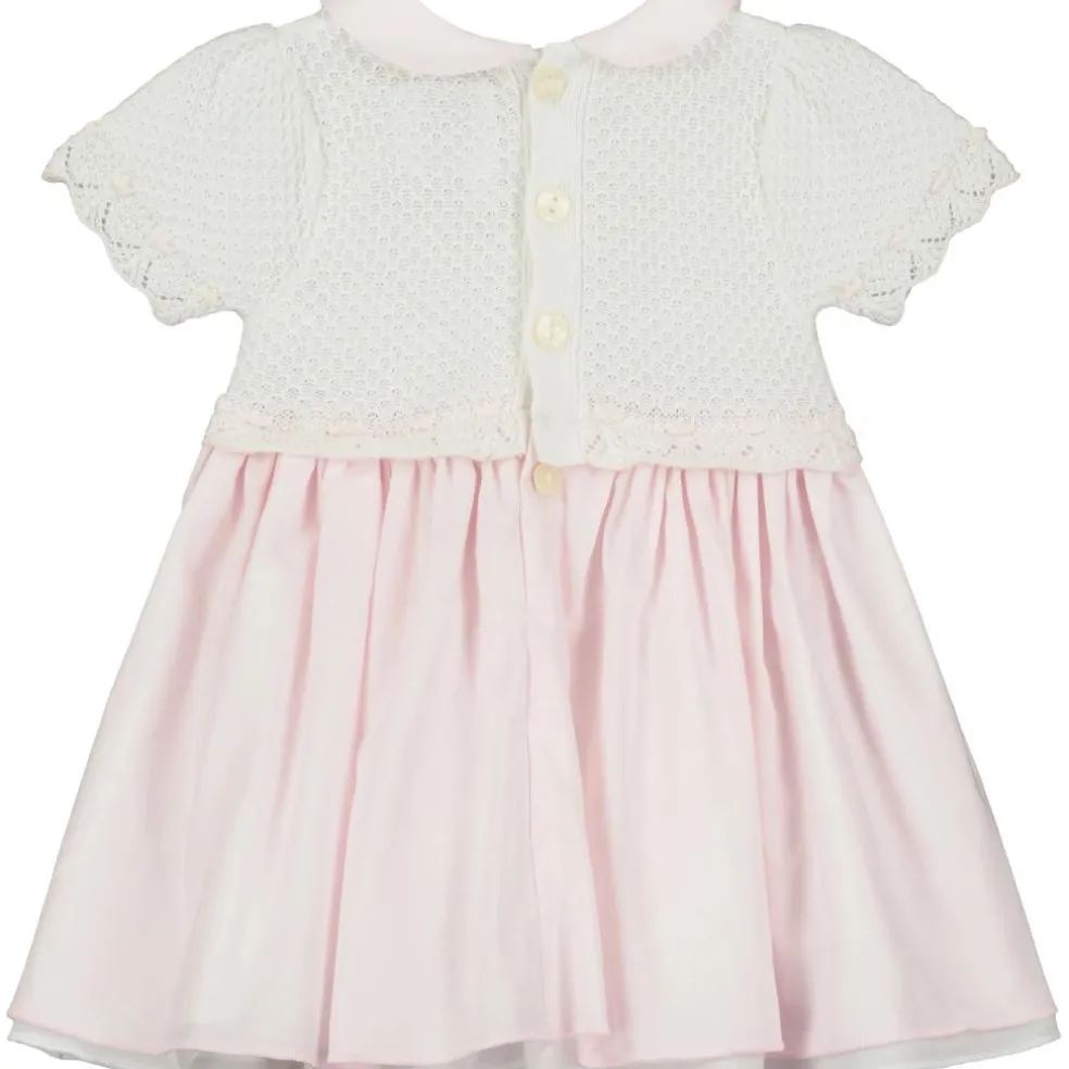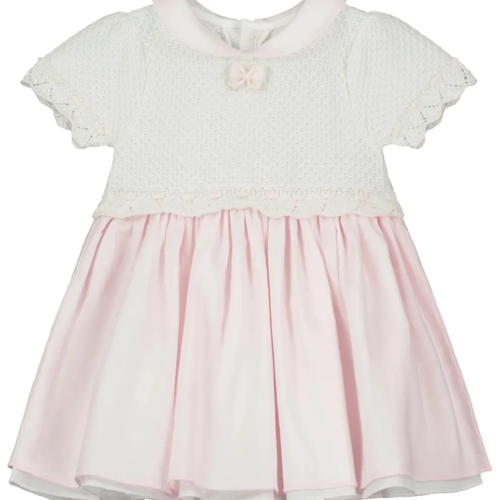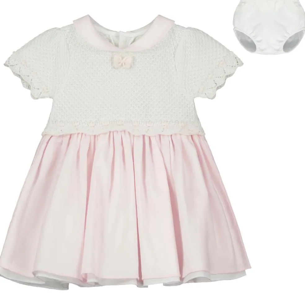 This dress is absolutely lovely with its knitted upper and layered skirt. The beautifully knitted top of the dress has stitches of pink and white lace effect and spots. A pink rounded collar and full gathered pink skirt co-ordinate beautifully with the top. The cotton skirt is layered with a white underskirt for fullness and comes with white pants to complete this adorable outfit.