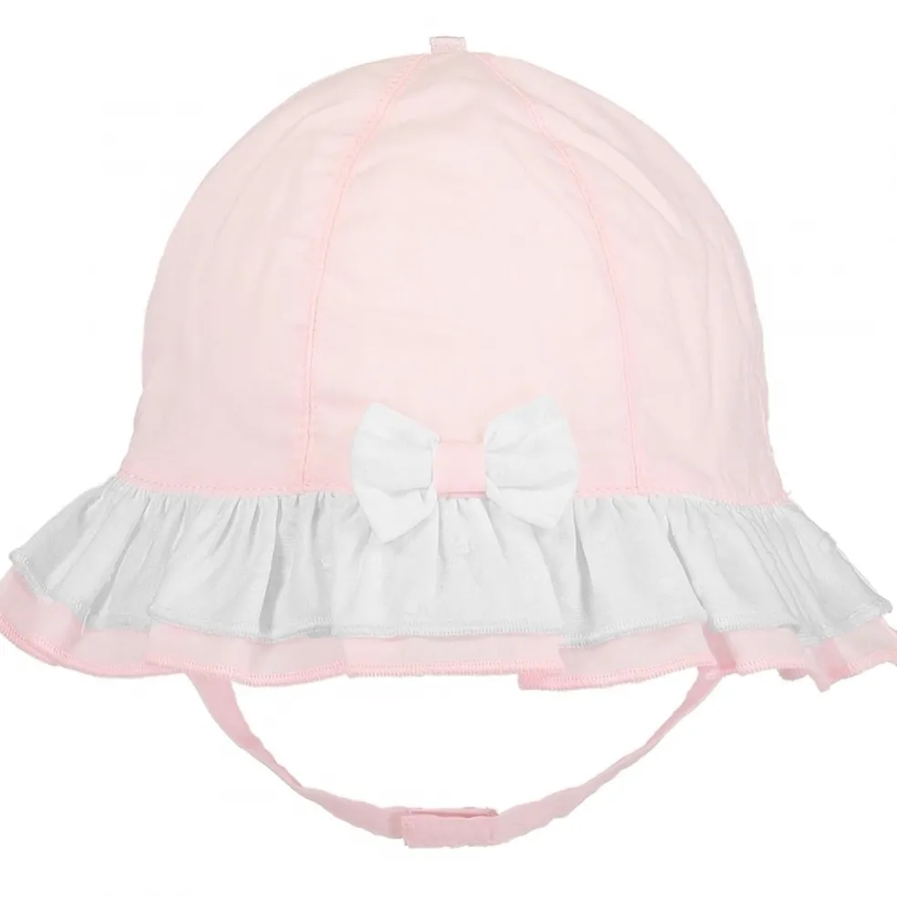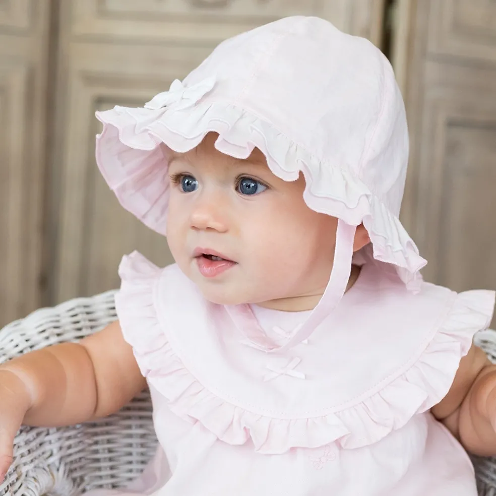 A very pretty pink soft cotton sun hat with a wide double brim, the top layer being in spot embroidered broderie anglais, perfect to match any Emile et Rose pink garment and great as a summer essential. The hat is trimmed with a single white bow with a pink centre and it has a neat chin strap with soft Velcro fastening.