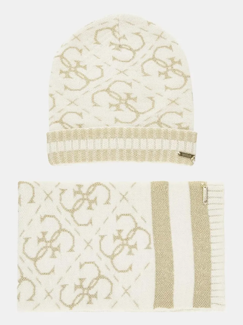 Knitted pull on hat and matching scarf with a gold metallic Guess logo running through the knitted fabric.