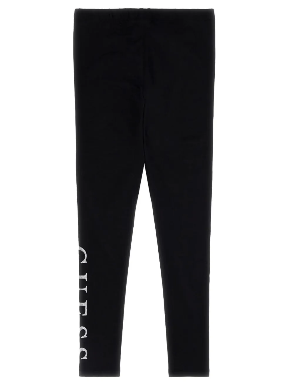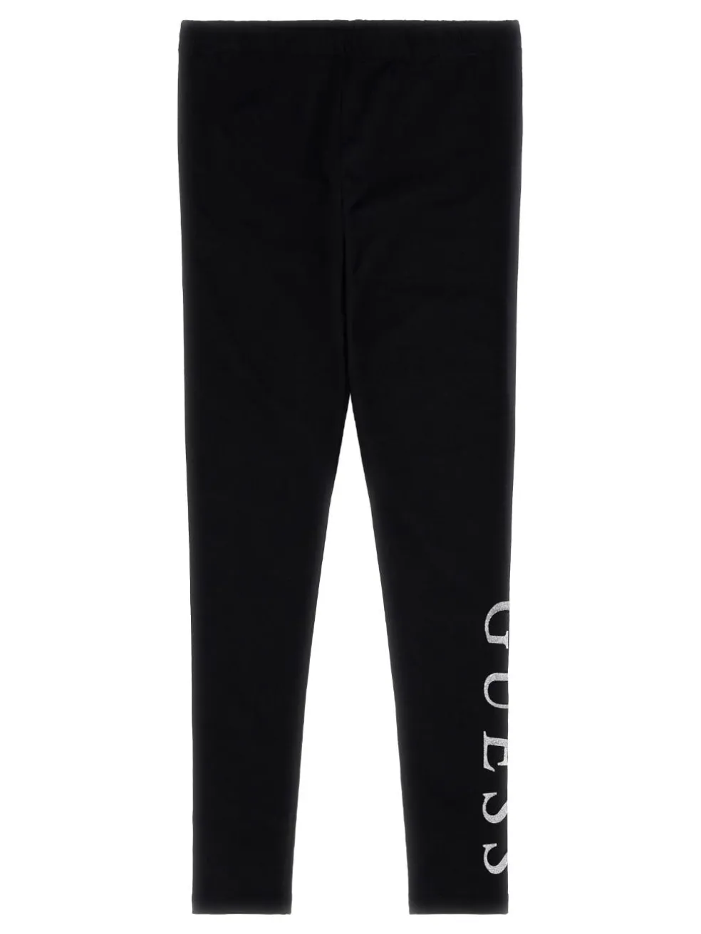 Full length leggings with a fully elasticated waistband and silver glitter Guess logo down one leg.