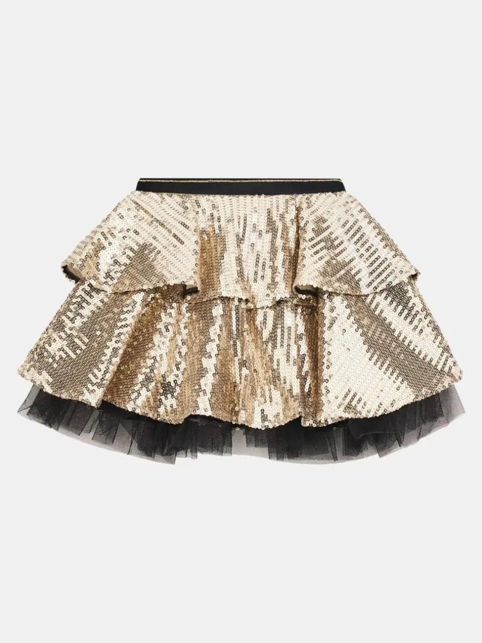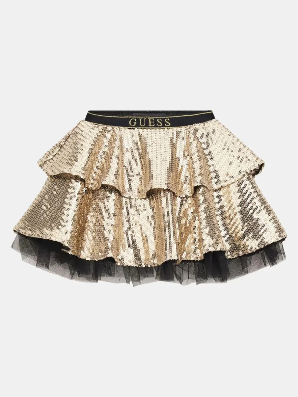 Gold sequinned tiered skirt is fully lined and has a layer of soft tulle for extra volume. The skirt has a fully elasticated waistband with the Guess logo woven in a gold metallic thread.