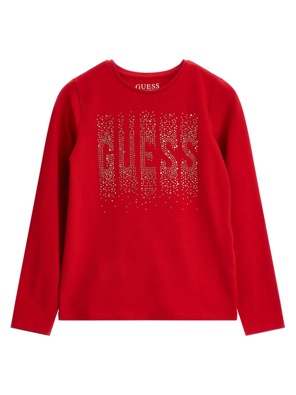 Long sleeved t shirt with a round neckline finished with gold diamanté Guess logo on the front.