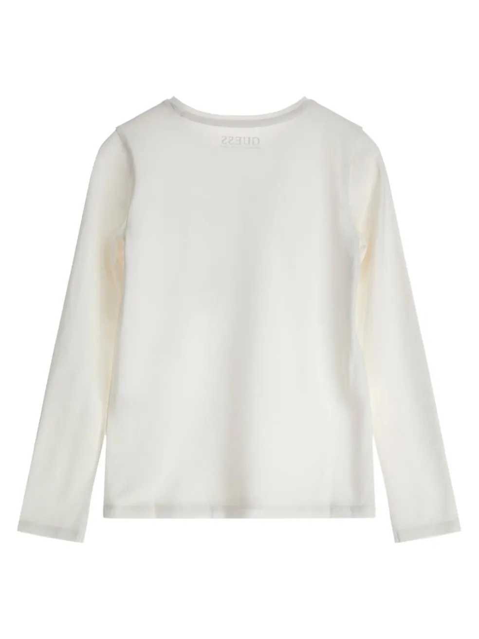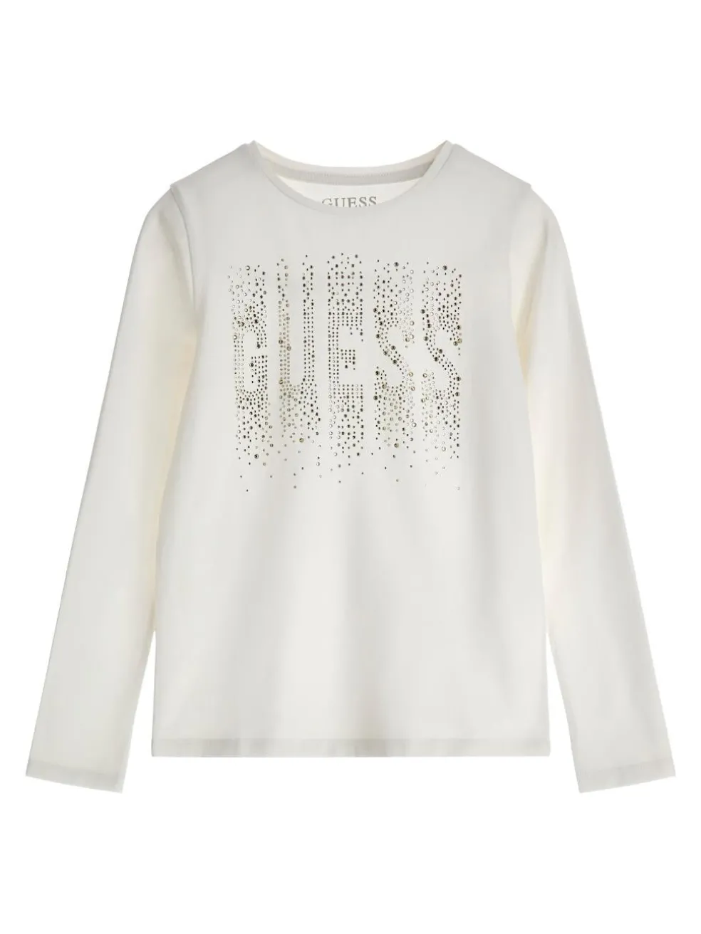 Long sleeved t shirt with a round neckline finished with gold diamanté Guess logo on the front.
