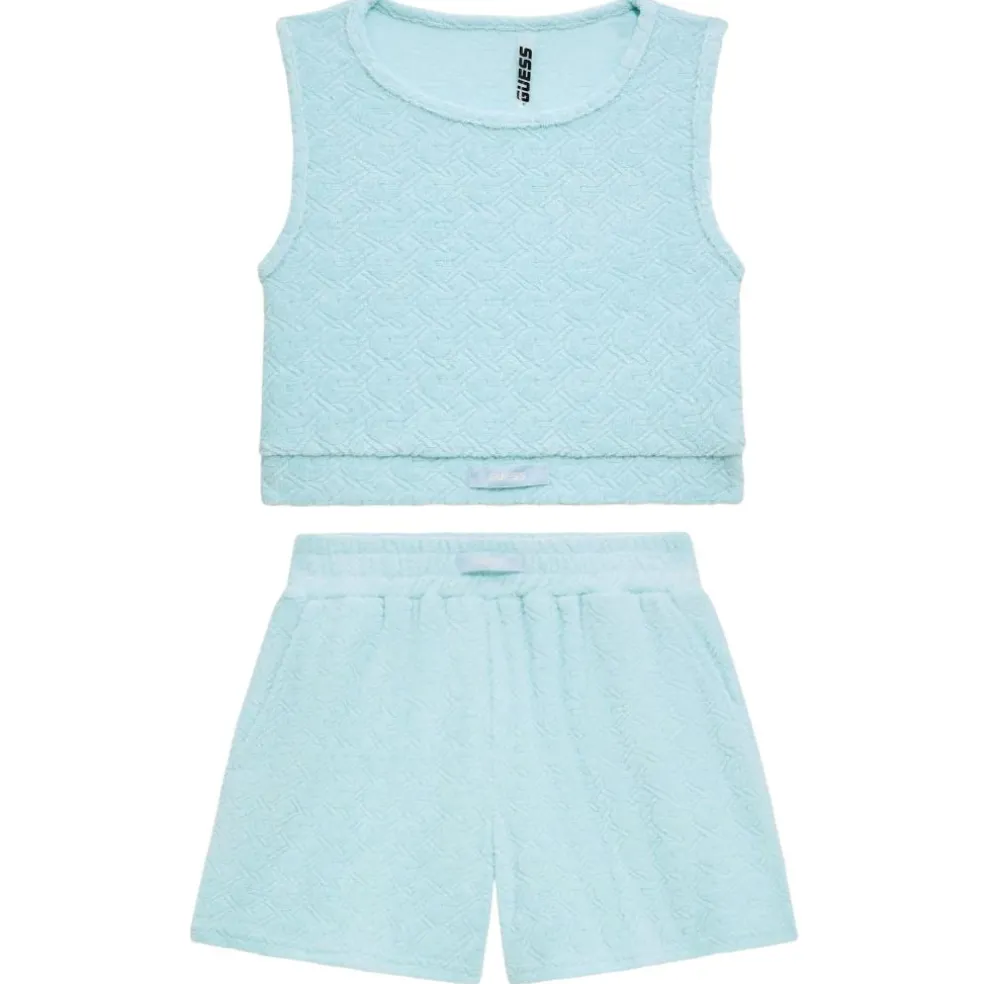 Sleeveless shorter length sporty top with a round neckline, easy to wear shorts with a fully elasticated waistband.