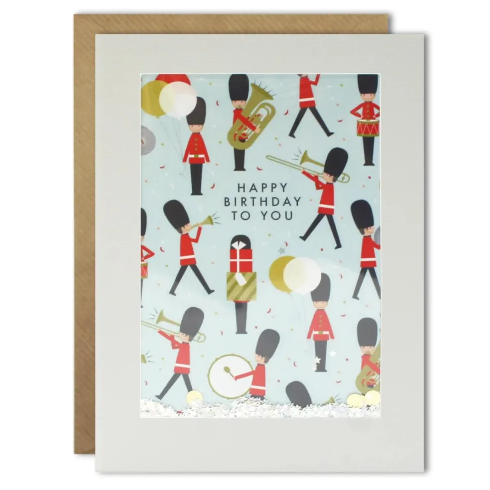 A hand finished birthday card. The image on the front features a guards band themed pattern, The text on the front reads ‘Happy Birthday To You’. The card is blank inside for your own message.