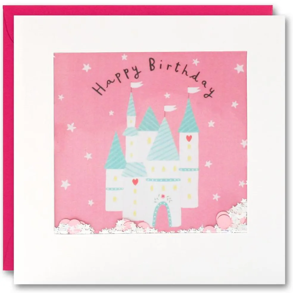 A hand finished children’s birthday card, illustrated by Katherine Hartley. The image on the front shows a white and turquoise fairy castle on a pink background.