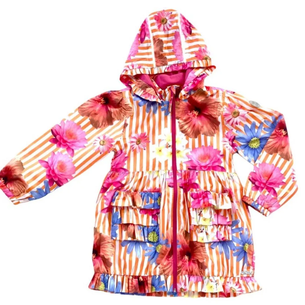 Floral print jacket with a detachable hood and a front zip fastening and half cotton lining, adjustable inside drawstring waist, ruffles to pocket’s and hemline.