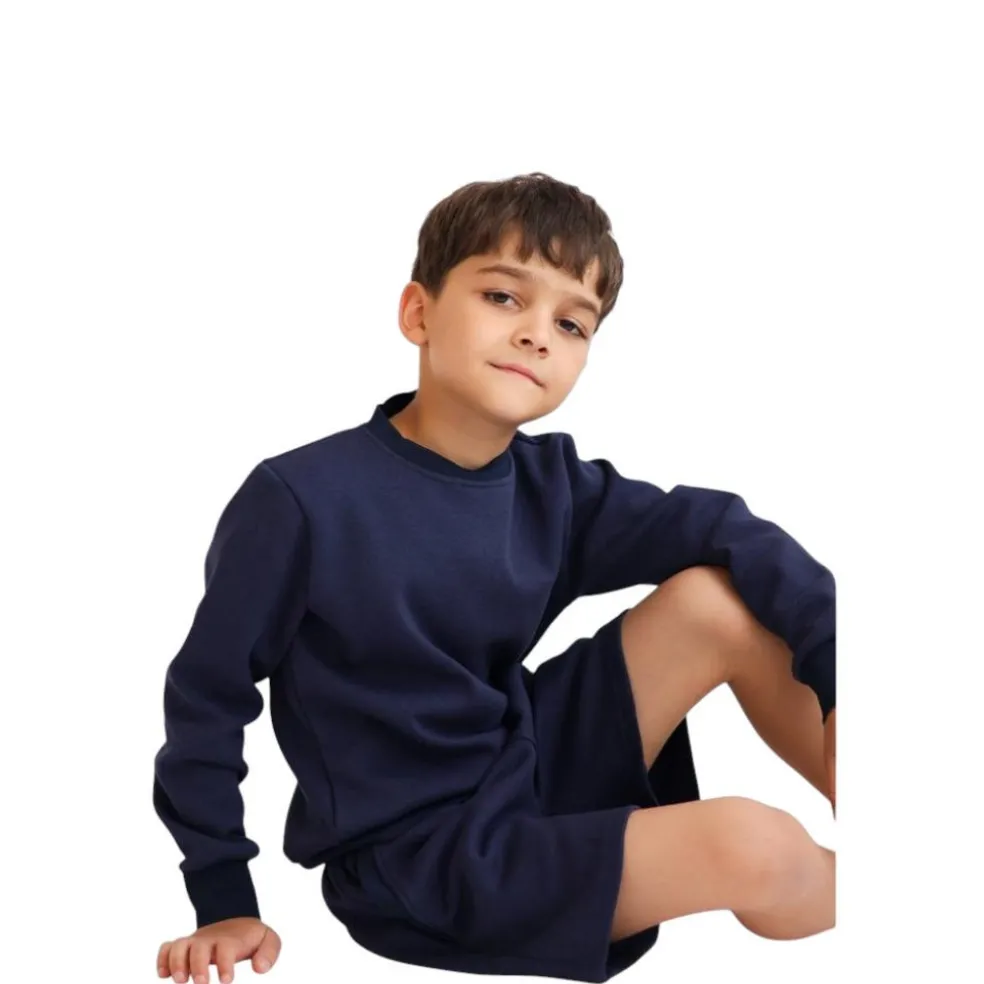 Long sleeved sweatshirt with ribbed collar, cuffs and hemline, matching shorts have a fully elasticated drawstring waistband and two side pockets.