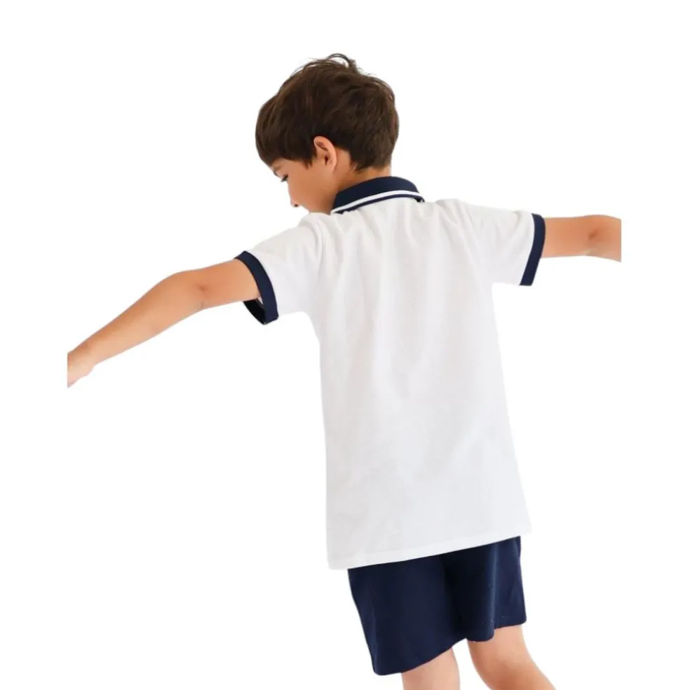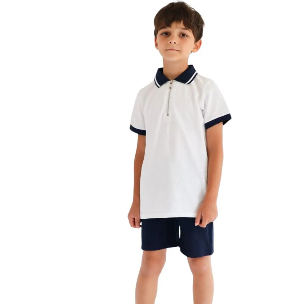 Short sleeved polo shirt with front zip fastening and contrasting navy trim, matching shorts have a fully elasticated drawstring waistband and two side pockets.