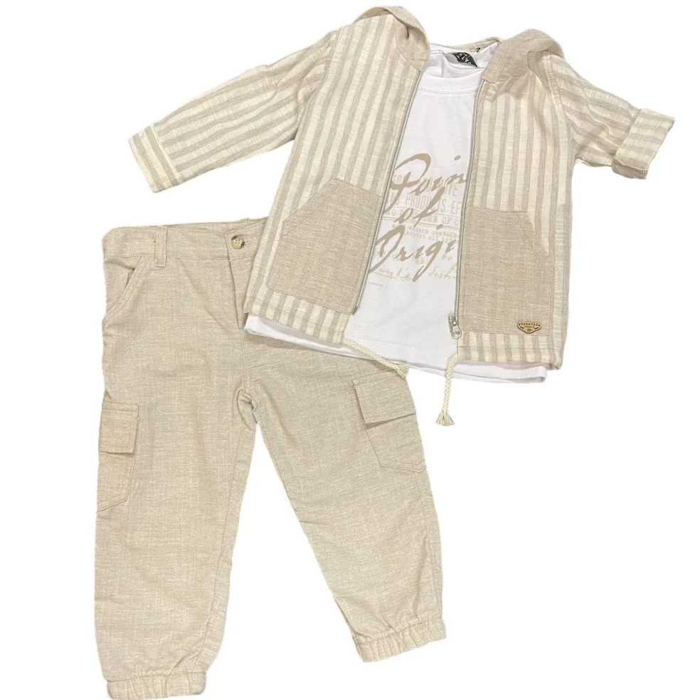 Short sleeved t shirt has a printed design on the front and a round neckline. Matching cotton trousers have an adjustable waistband, cargo pockets on the sides and are elasticated at the ankles.