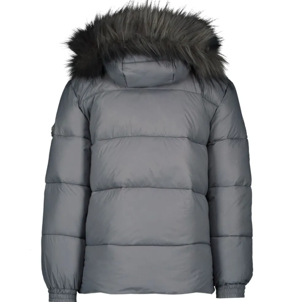 Hooded jacket with detachable faux fur trim, zipped pockets and front zip fastening with press studs.