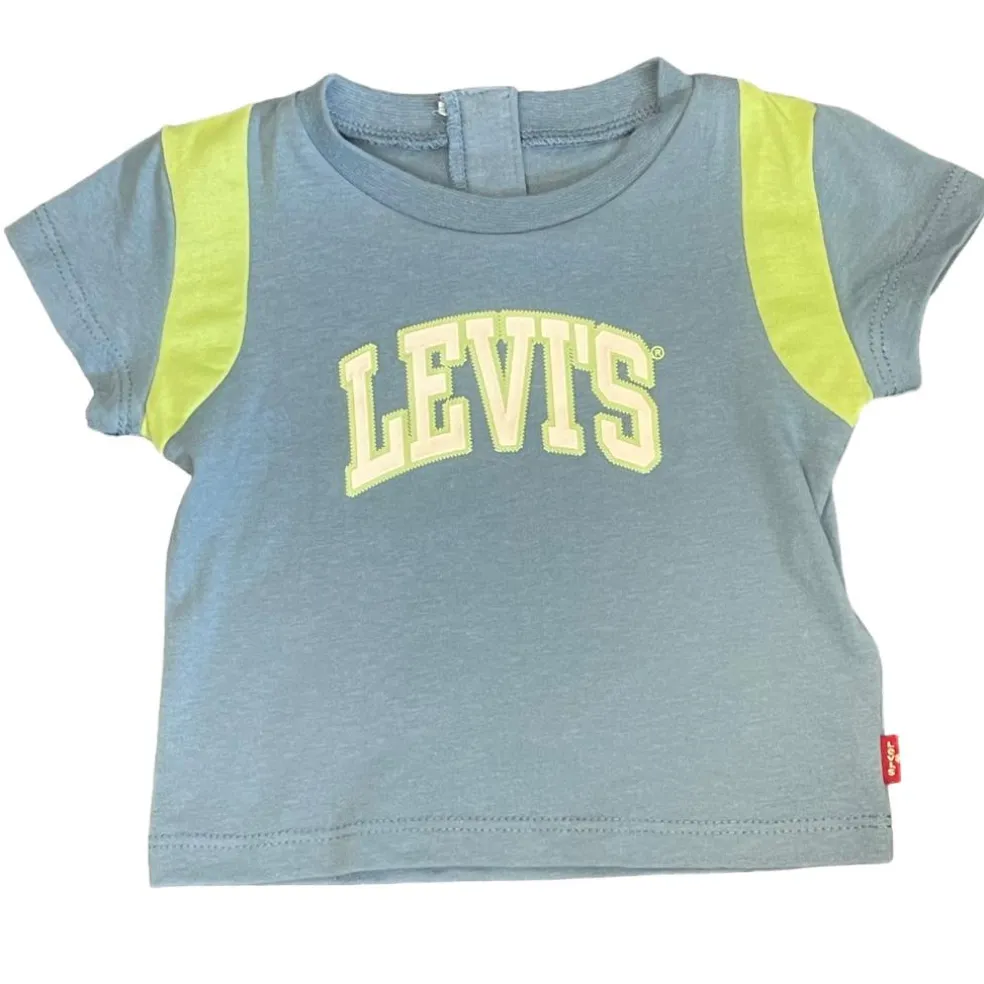 Short sleeved t shirt with a round neckline and contrasting coloured yokes around the shoulders, finished with a printed Levi’s logo on the front.