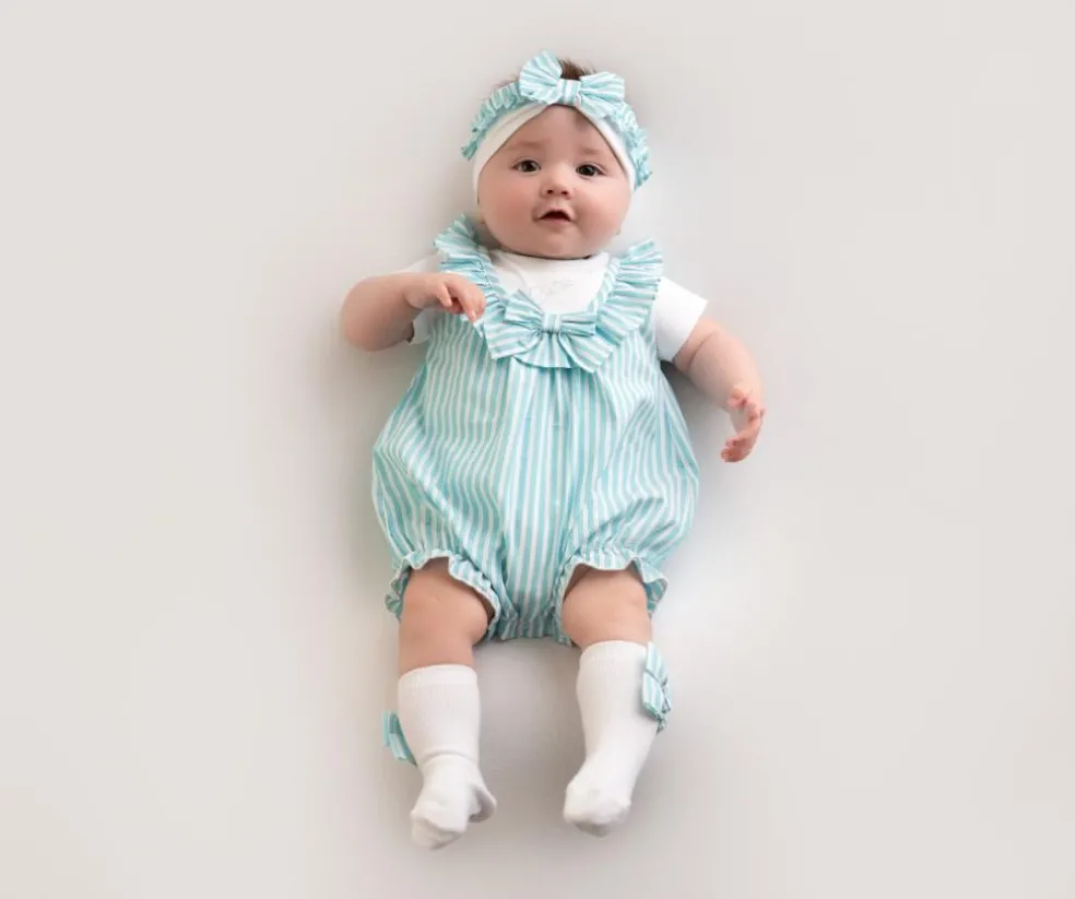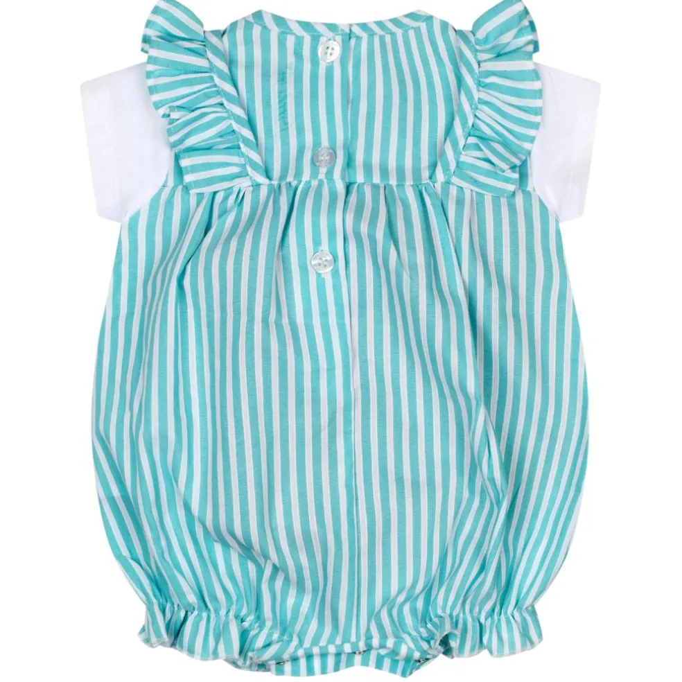 Striped seersucker romper with attached jersey top and finished with frill, bow and diamante branding.