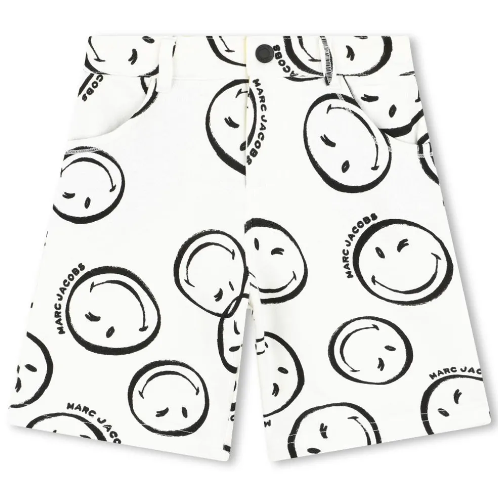 Cotton jersey smiley face bermuda shorts in an all over smiley print design, the shorts have an elasticated waistband at the back and contrasting appliqued back pockets.