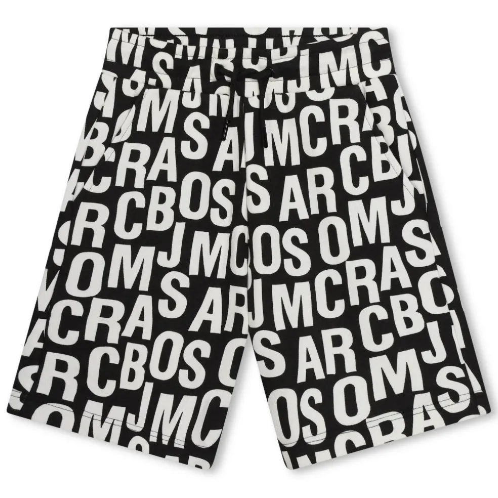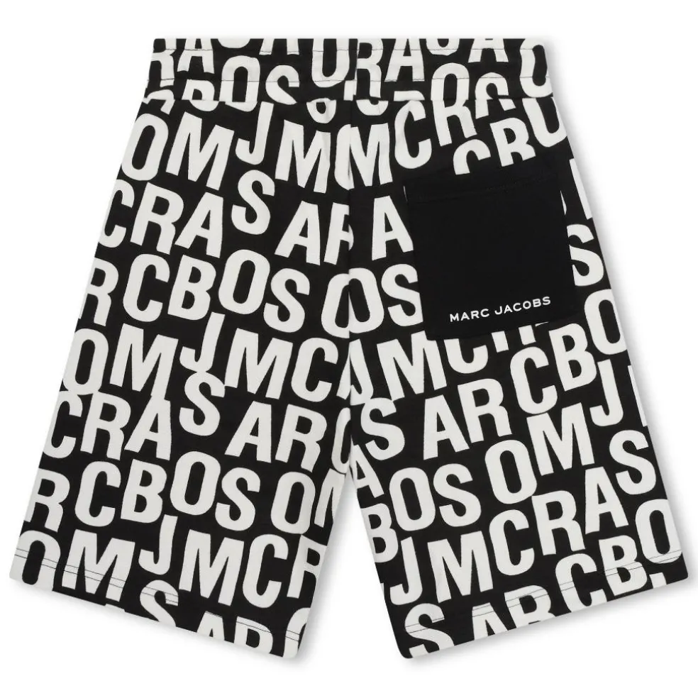 Bermuda shorts with an elasticated waistband and a decorative drawstring, the shorts are in a jumbled Marc Jacobs all over printed design with an appliqued pocket on the back.