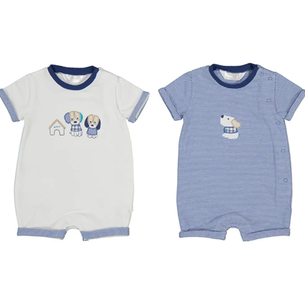 Set of two short rompers with appliqued and embroidered doggy designs on the front.