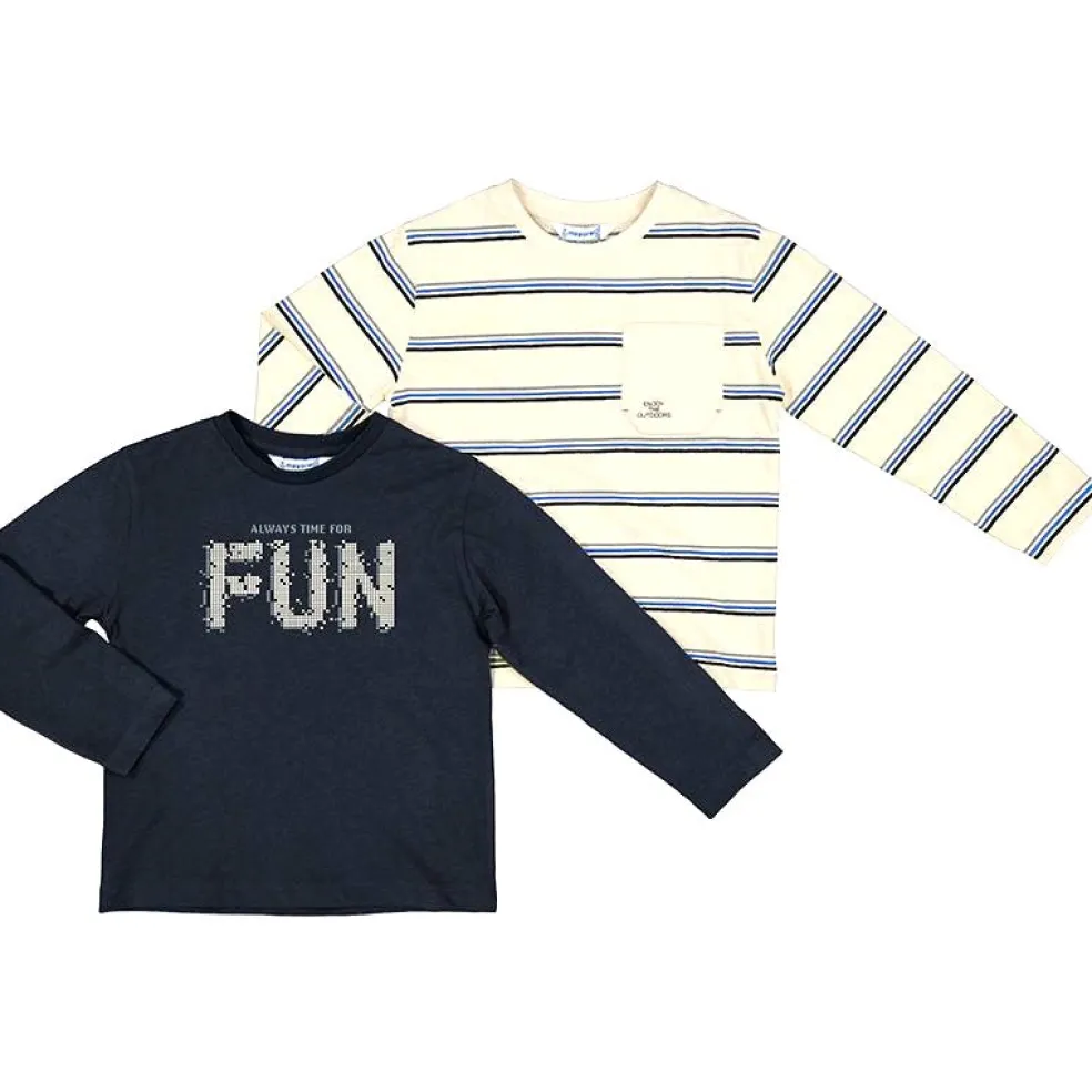 Two t shirts with round necklines, one plain with a “FUN” design on the front and the other in a striped fabric with an appliqued pocket on the front.