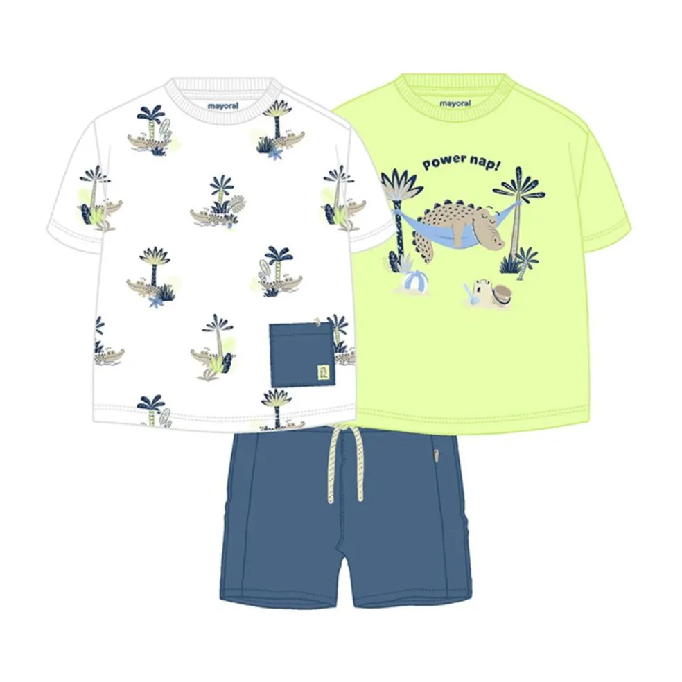 Two t shirts one with an all over printed design and one plain with just a printed design on the front, contrasting easy to wear sweatshirt shorts with an elasticated drawstring waistband.