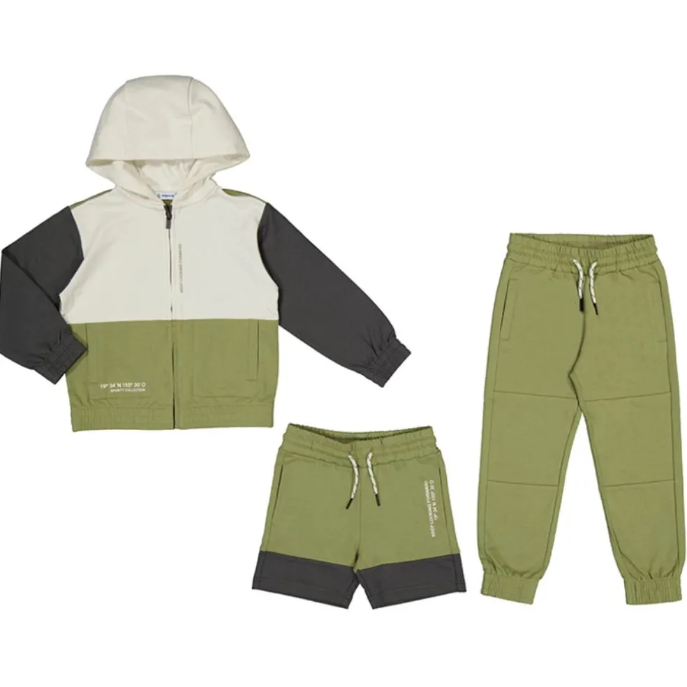 Long sleeved hooded top with front zip fastening and two side pockets supplied with a pair of shorts and a pair of jogging bottoms both of which have fully elasticated drawstring waistbands.
