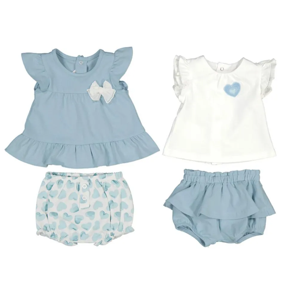 Pretty girls four piece set in a lovely shade of duck egg blue and white comprising of two tops and two pairs of shorts which can be mixed and matched to create different looks.