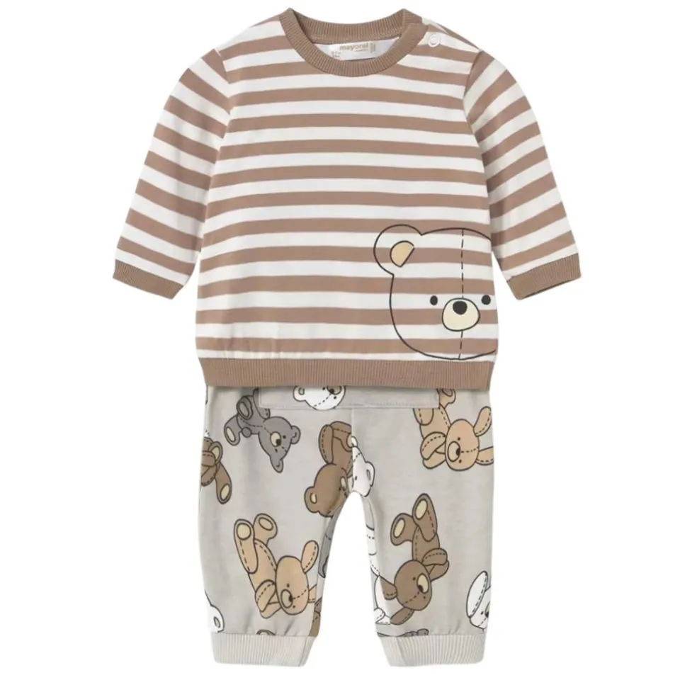 2x long sleeved sweatshirt style tops both finished with a printed teddy bear design on the front, supplied with 2 pairs of easy to wear pull on jogging style trousers which can all be mix and matched to create different outfits.