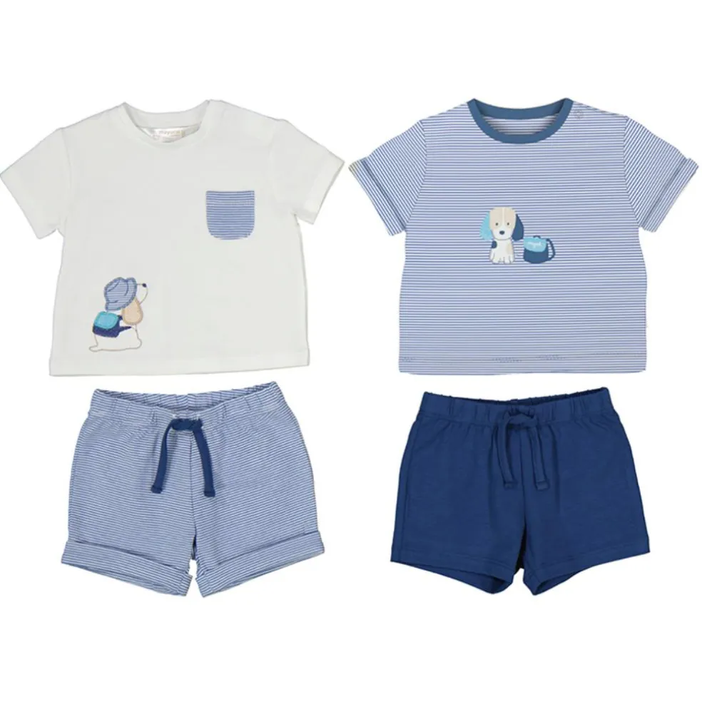 Four piece set comprising of two t shirts with appliqued and embroidered designs on the front and two pairs of shorts which have elasticated waistbands, all of which can be mixed and matched to create different looks.