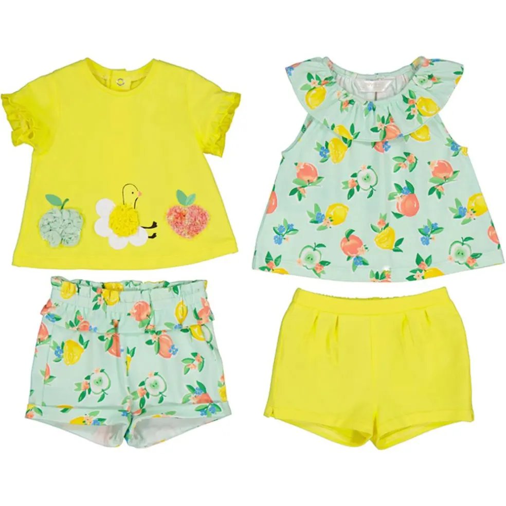 Two pretty short sleeved tops and two pairs of easy to wear shorts with elasticated waistbands which can be mixed and matched to create different looks.