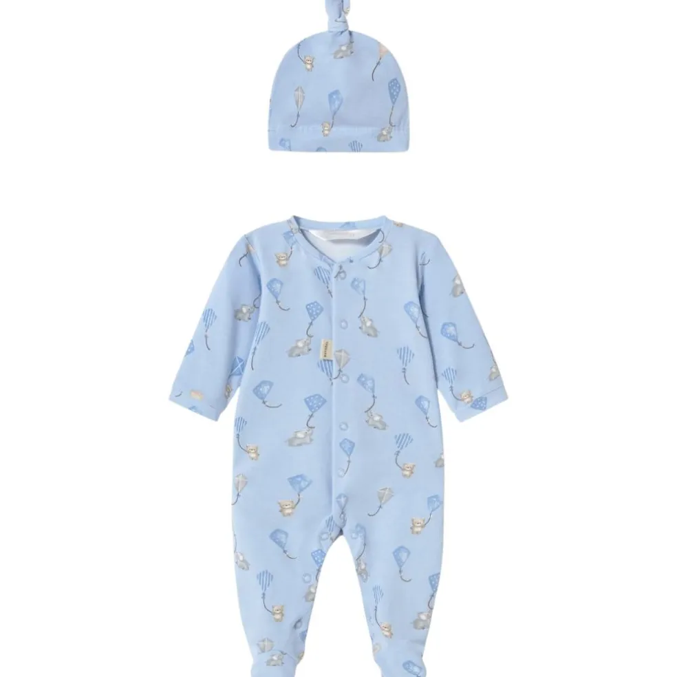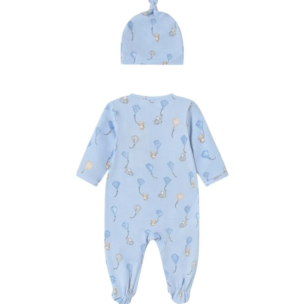 Front fastening all in one in an all over printed design supplied with a matching hat.
