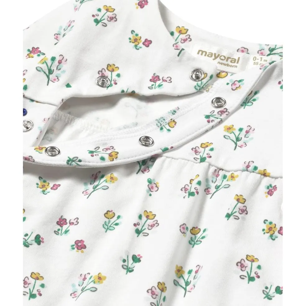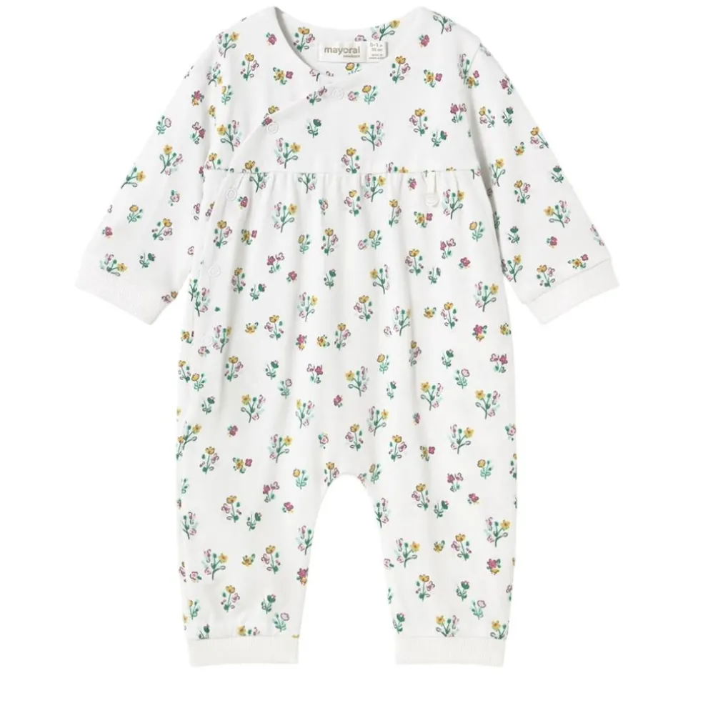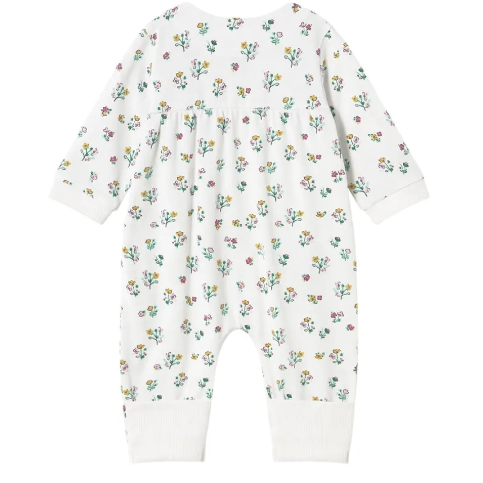 Front fastening all in one in a pretty all over floral print fabric, The bottom of the leg has a ribbed cuff which can be worn footless or folded over at the feet.