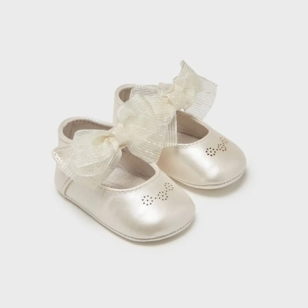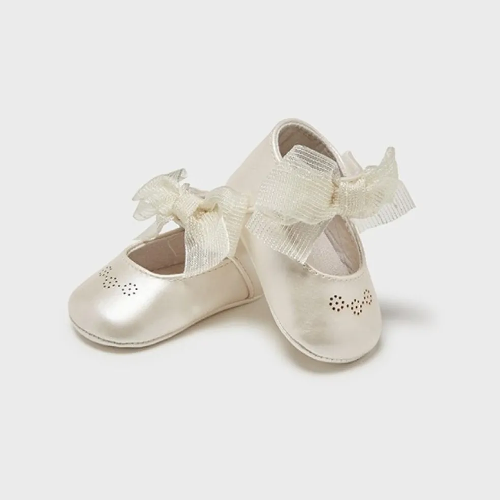 Mary Jane style baby shoes with velcro fastening and appliqued bows.