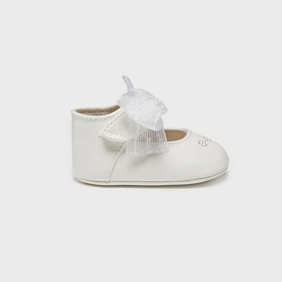 Mary Jane style baby shoes with velcro fastening and appliqued bows.