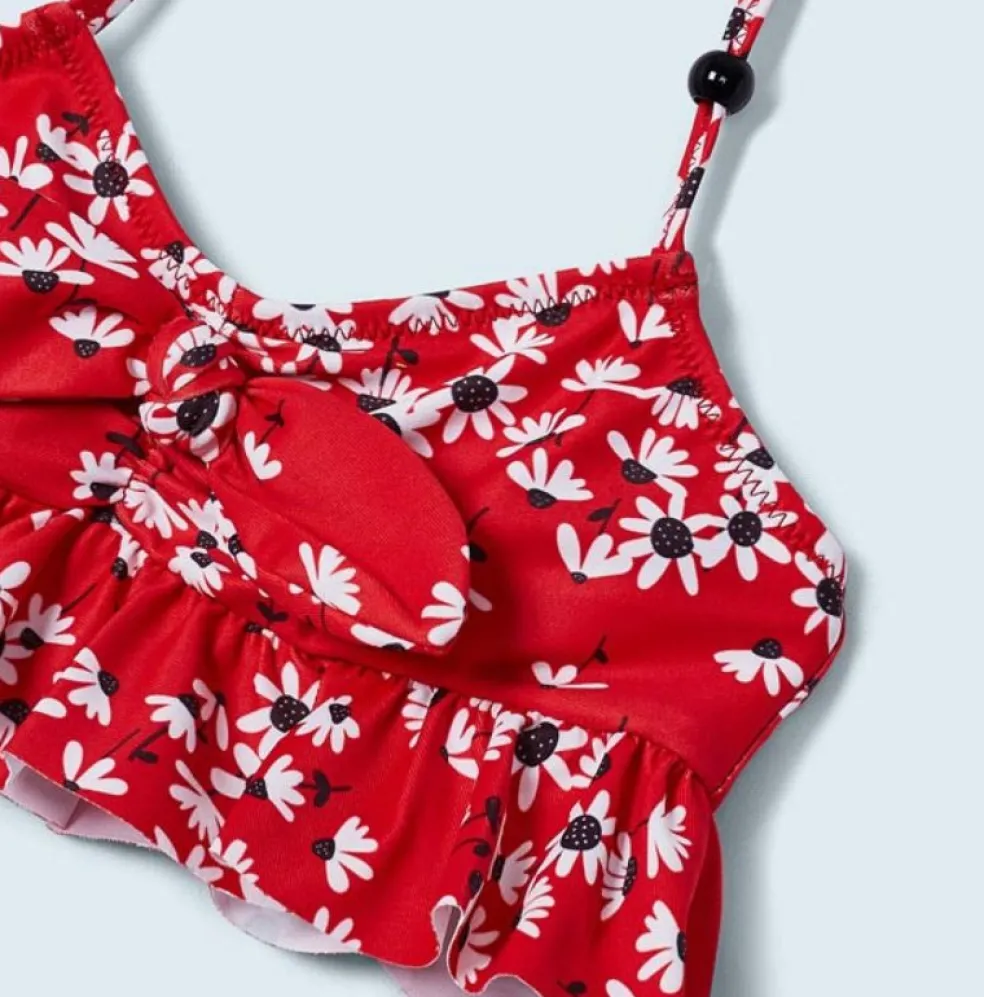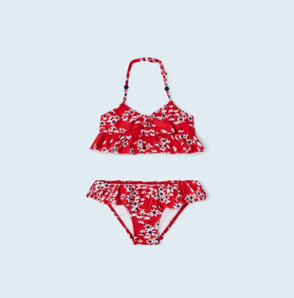 Bikini in an all over printed design, the top is elasticated at the back with a halter neck and is finished with a ruffle and an appliquéd bow on the front, the bikini bottoms are finished with a ruffle at the waistband.