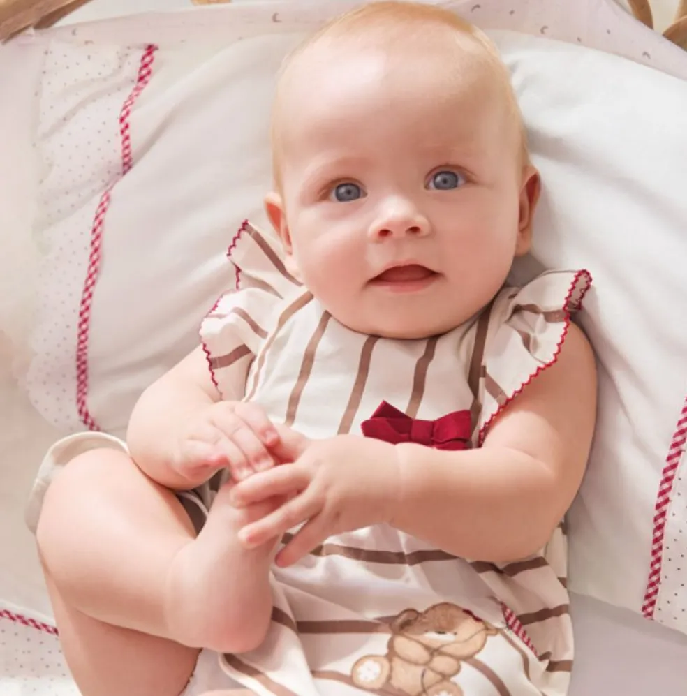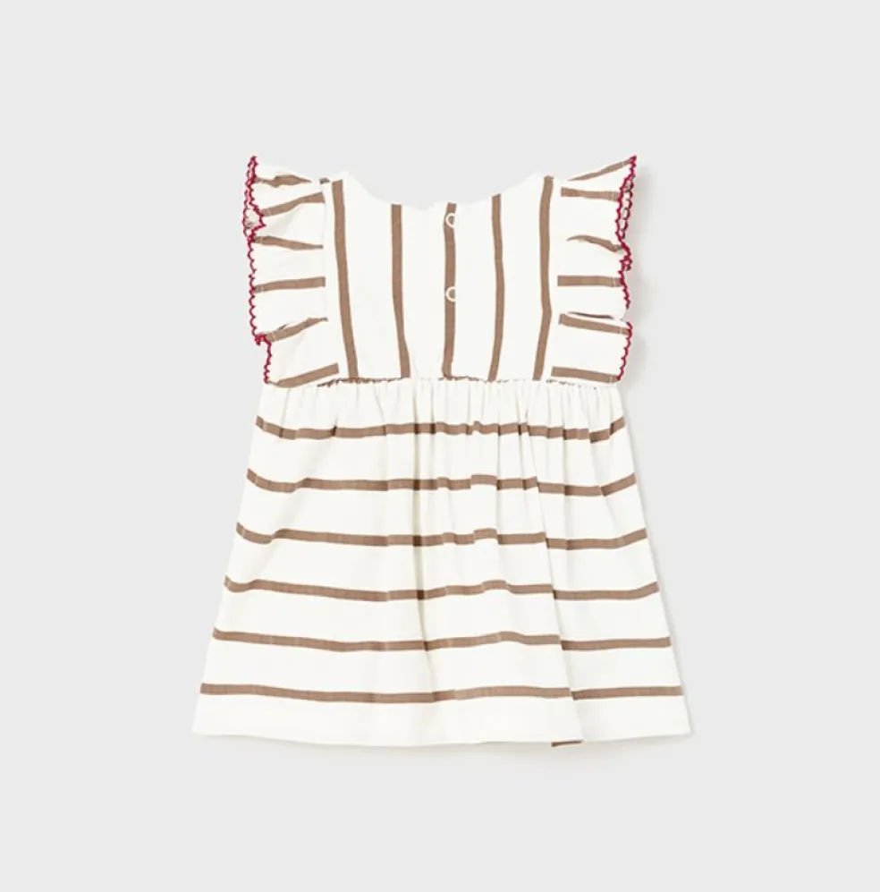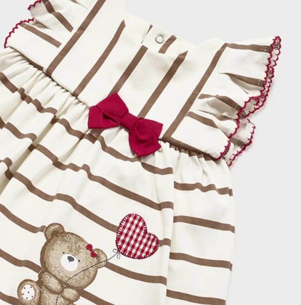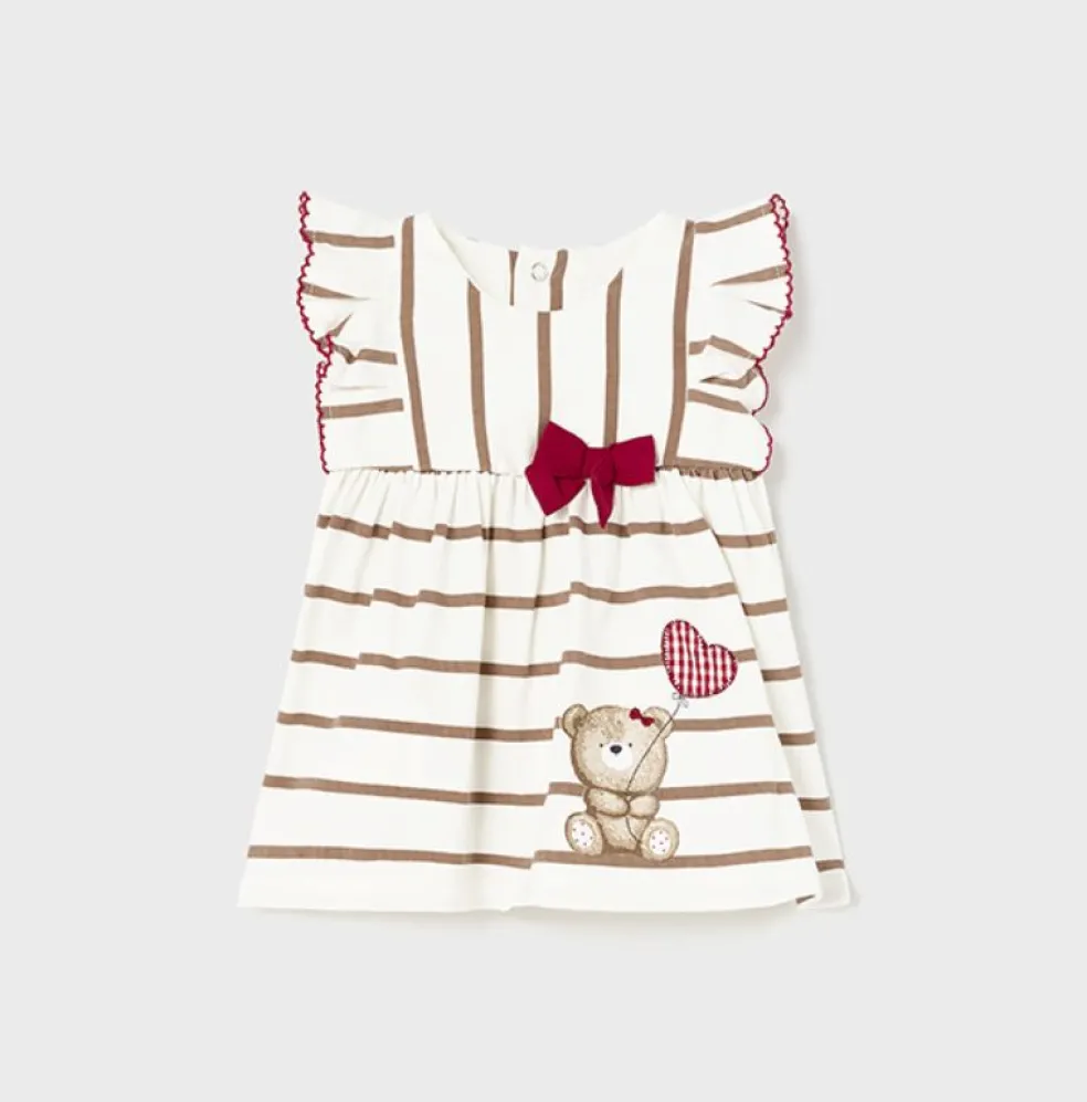 Baby girls striped dress with ruffle sleeves a printed teddy bear motif on the front and finished with an appliqued bow at the waist.