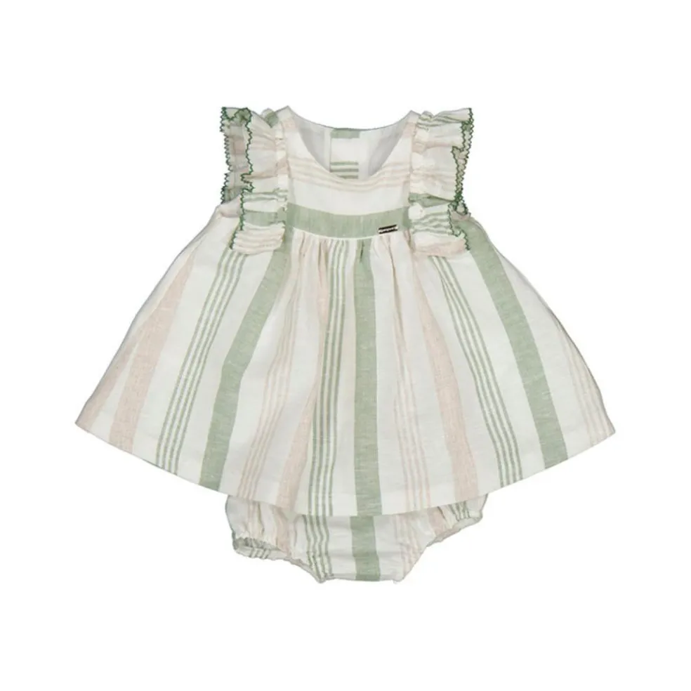 Gorgeous linen striped summer dress with ruffle sleeves a round neckline and back button fastening. Supplied with matching panties.