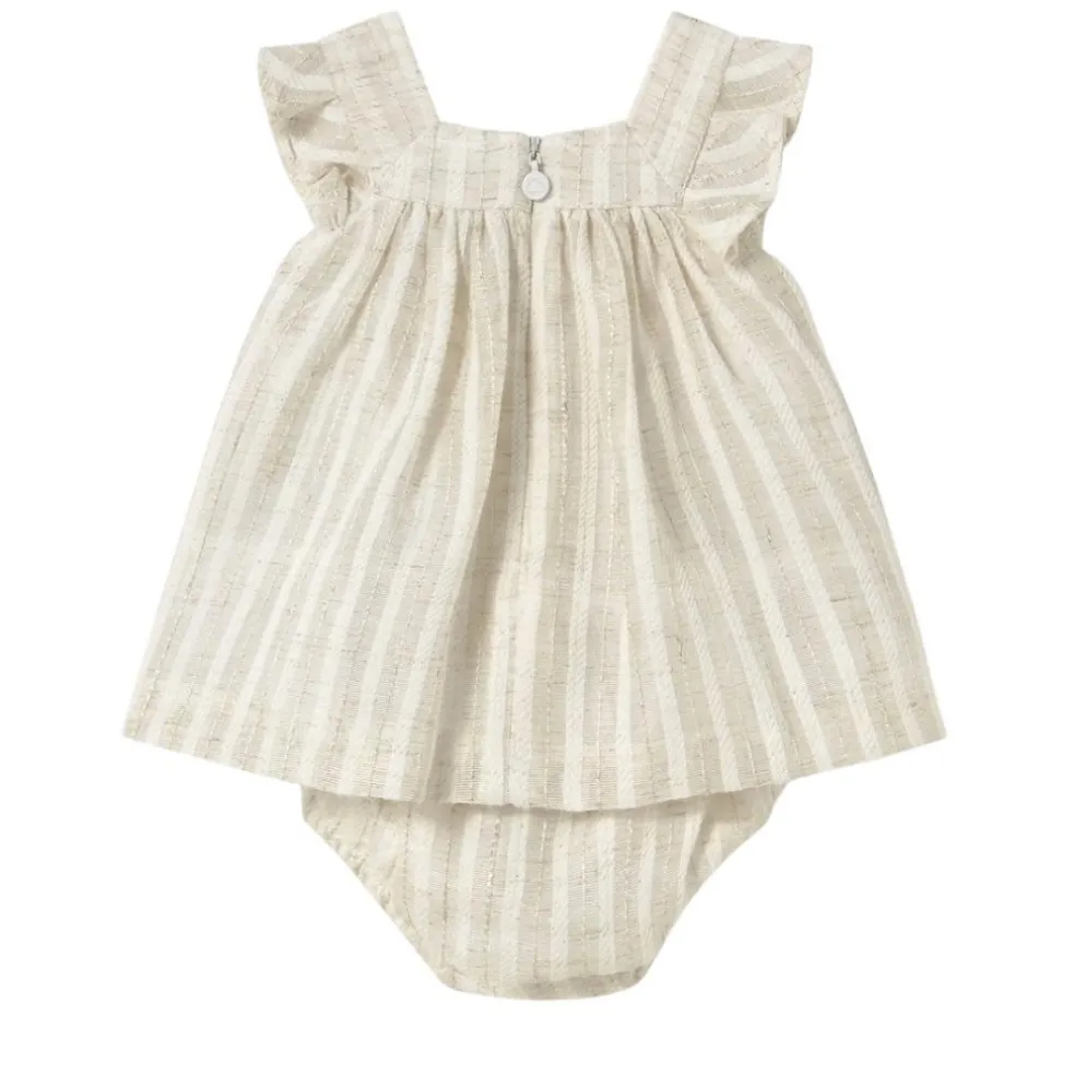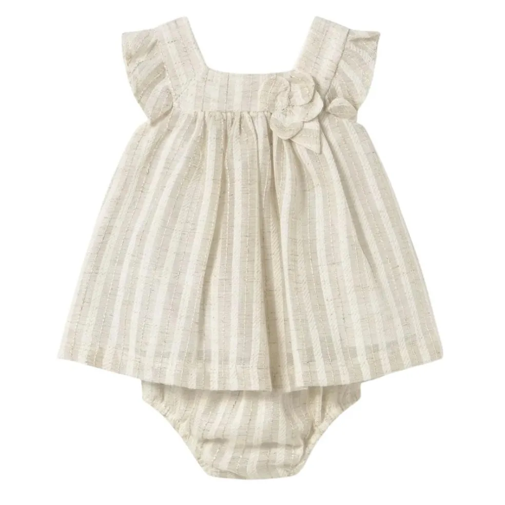 Fully lined summer dress with a back zip fastening, ruffle sleeves and finished with an appliquéd flower on the front, a matching pair of panties complete the outfit.