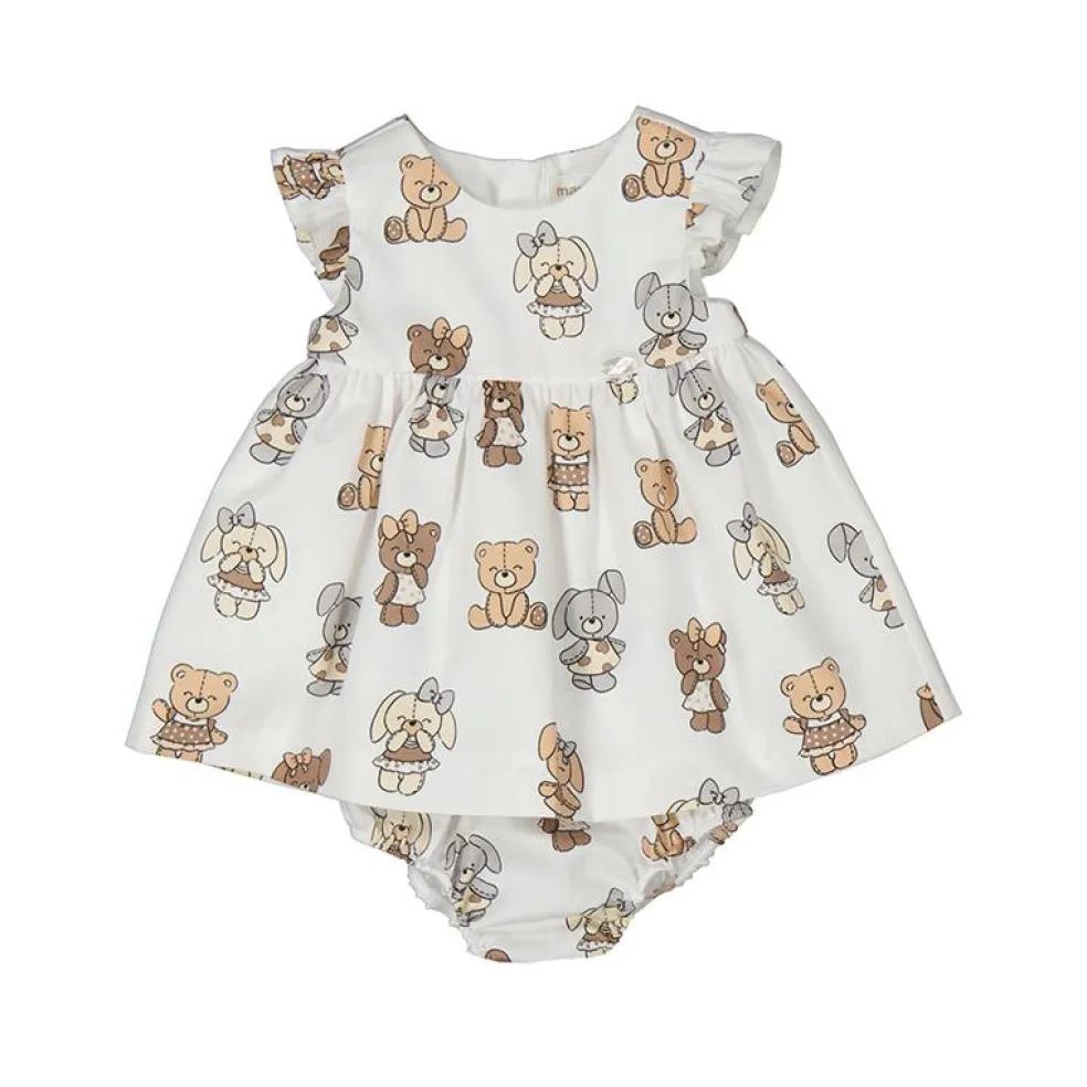 Fully lined summer dress finished with ruffle sleeves in a cute all over bear printed design, a matching pair of panties complete the outfit.