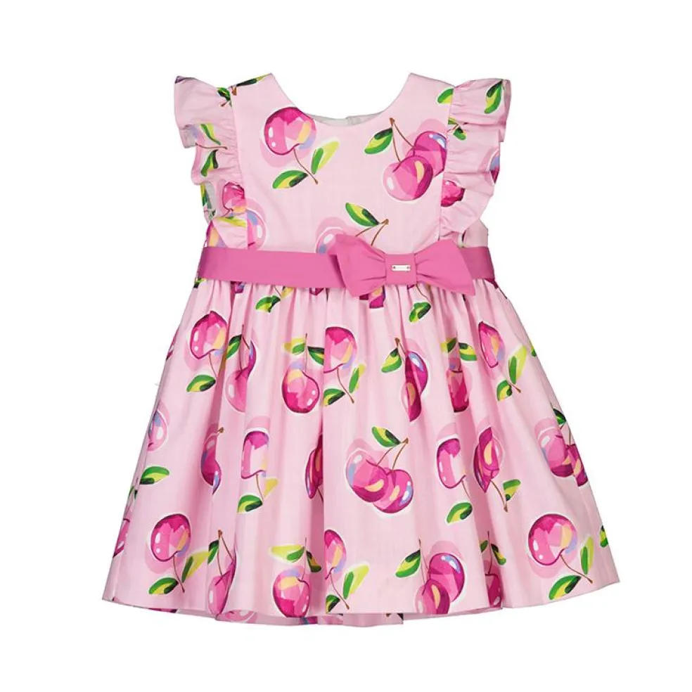 Fully lined summer dress in a pretty Cherry print design, finished with ruffle sleeves and a contrasting belt with an appliquéd bow on the front.