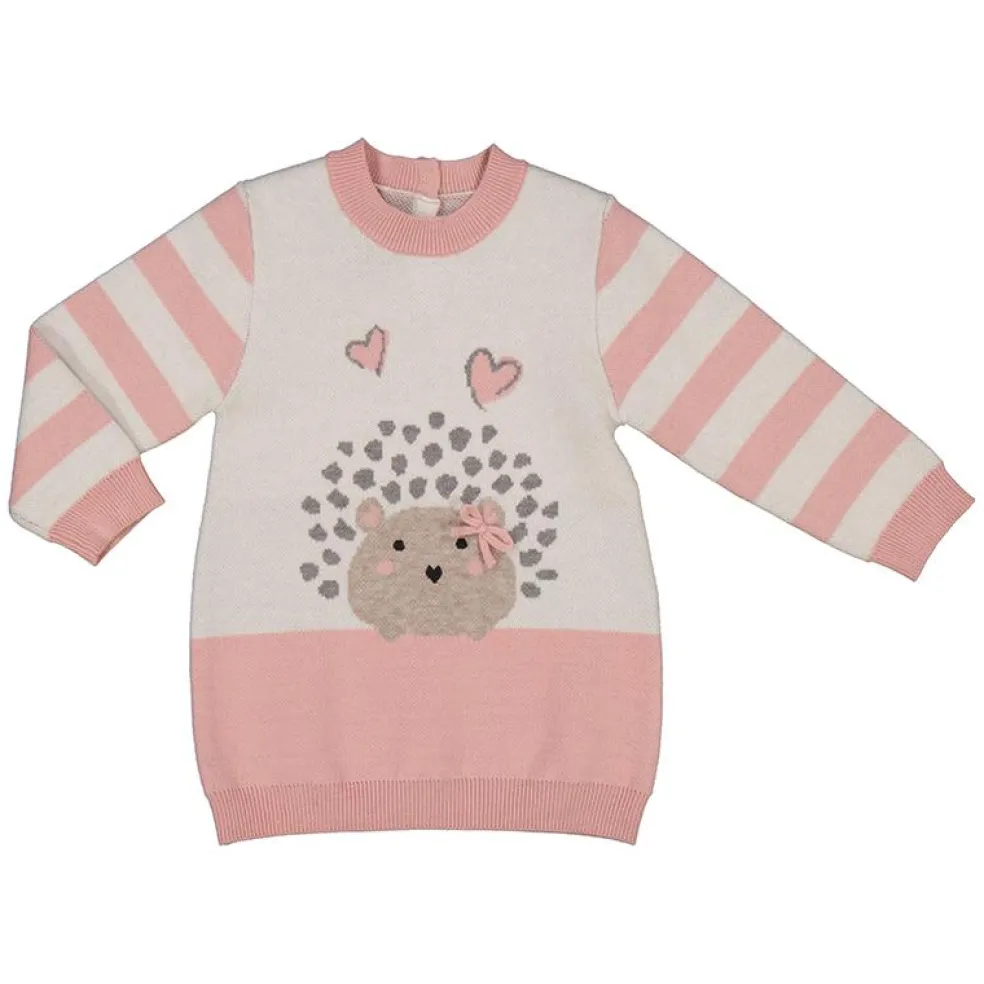 Long sleeved knitted dress with ribbed neckline, cuffs and hemline and a cute animal face on the front which is finished with an appliqued bow on one ear.