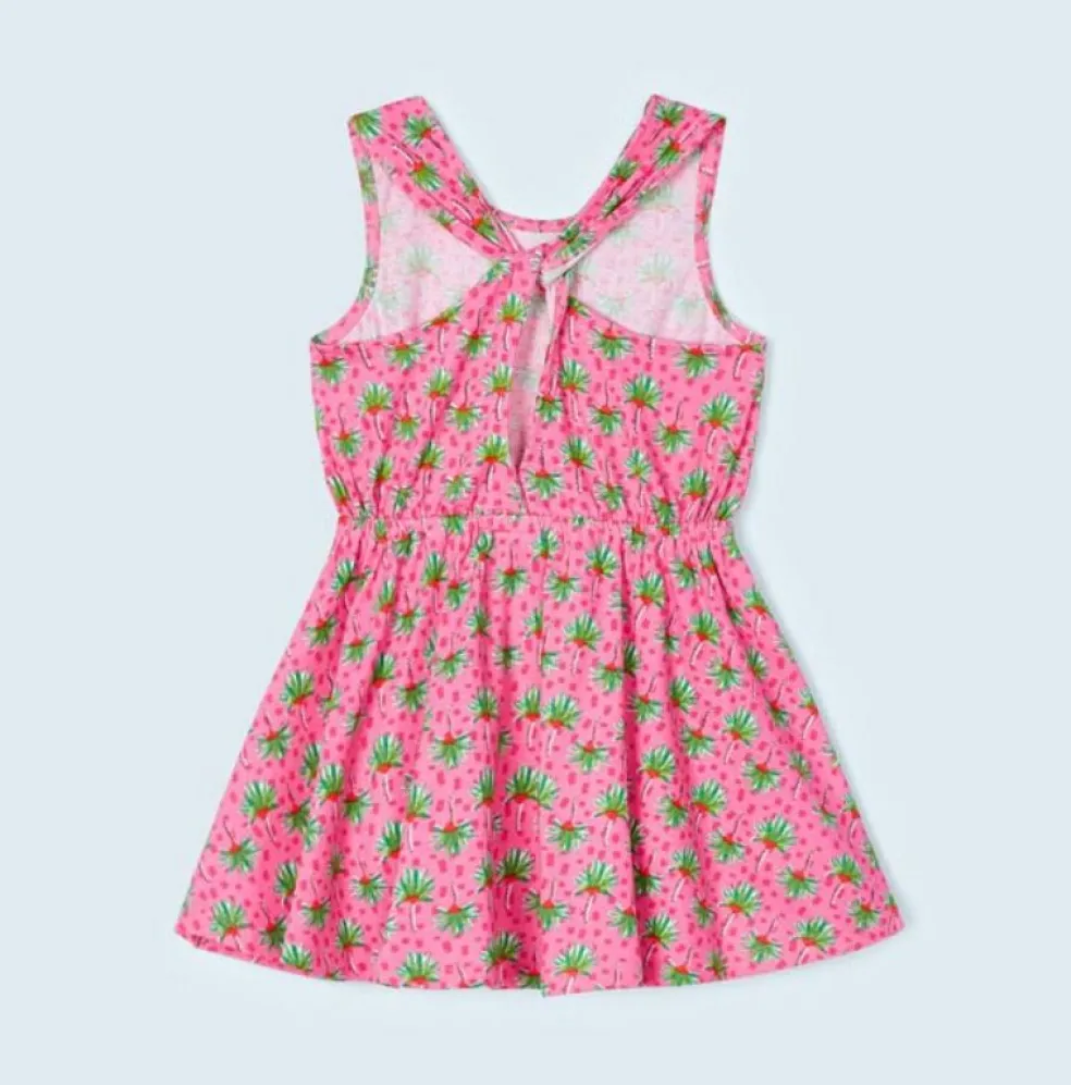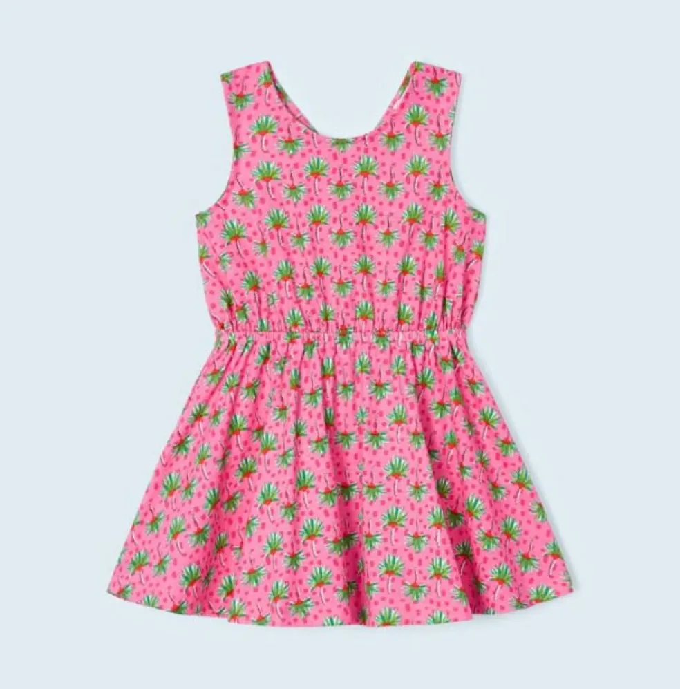 Sleeveless dress with a round neckline and cut out detailing at the back, this easy to wear dress has an elasticated waist and a full circle skirt.