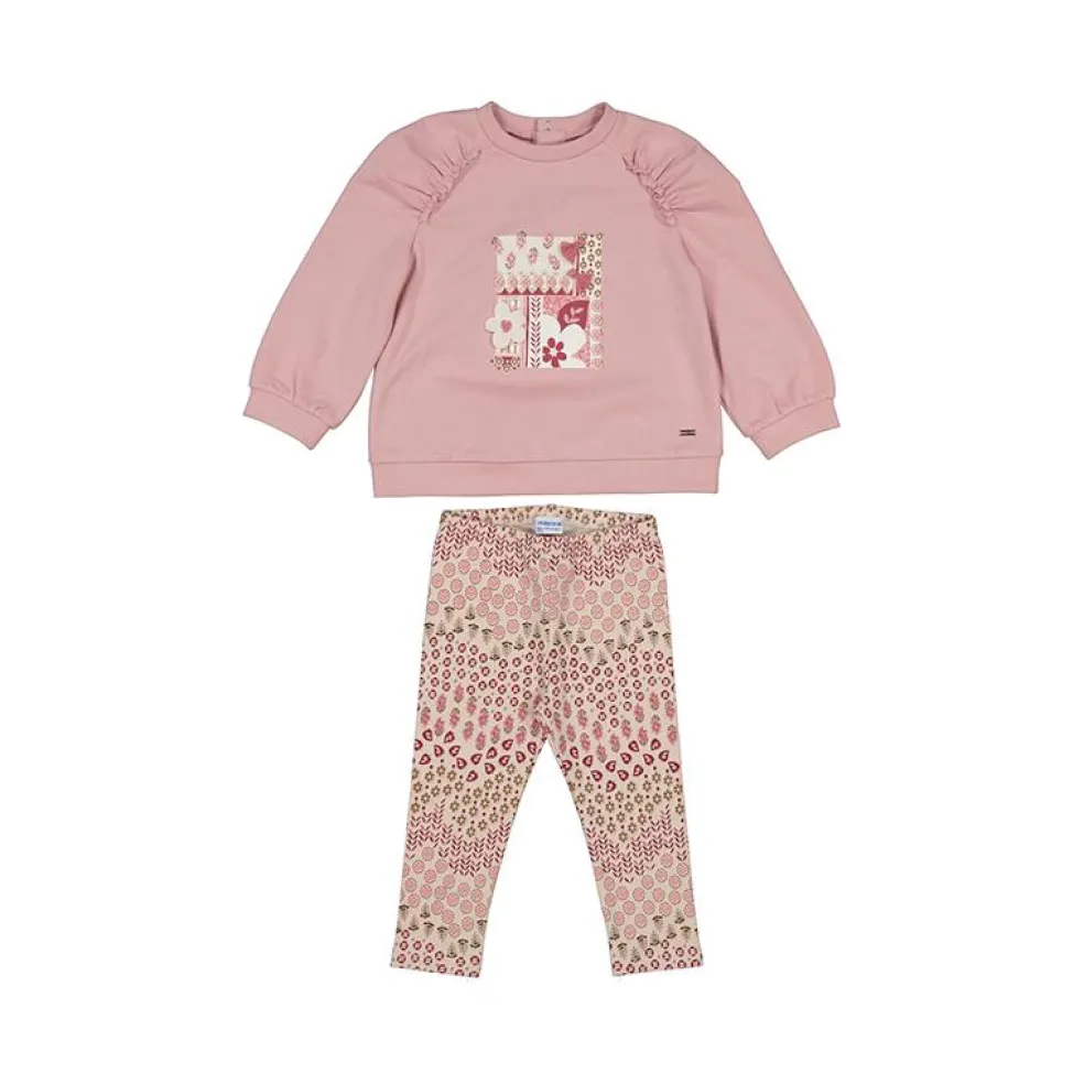 Long sleeved sweatshirt with rouched detailing at the shoulders and a pretty floral printed design on the front with appliqued detailing, matching full length print leggings have a fully elasticated waistband.