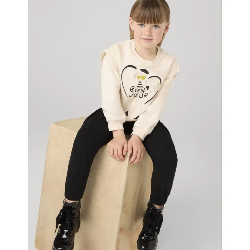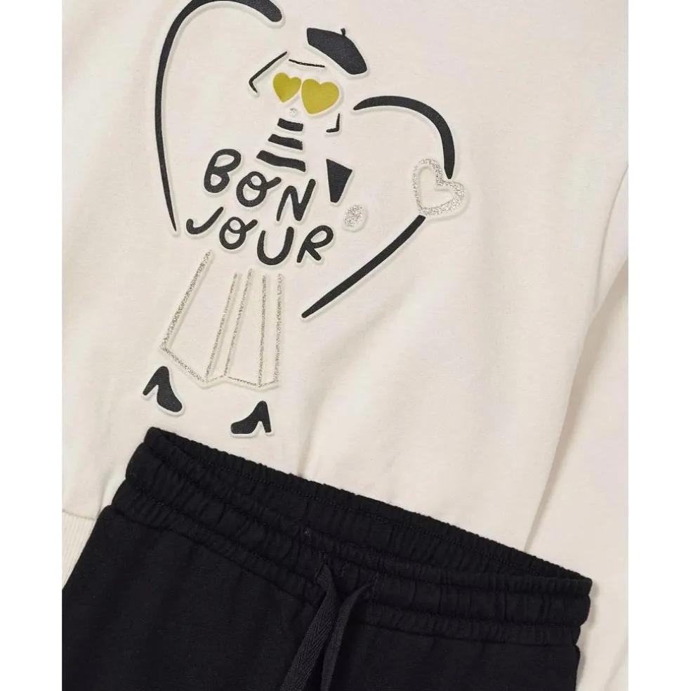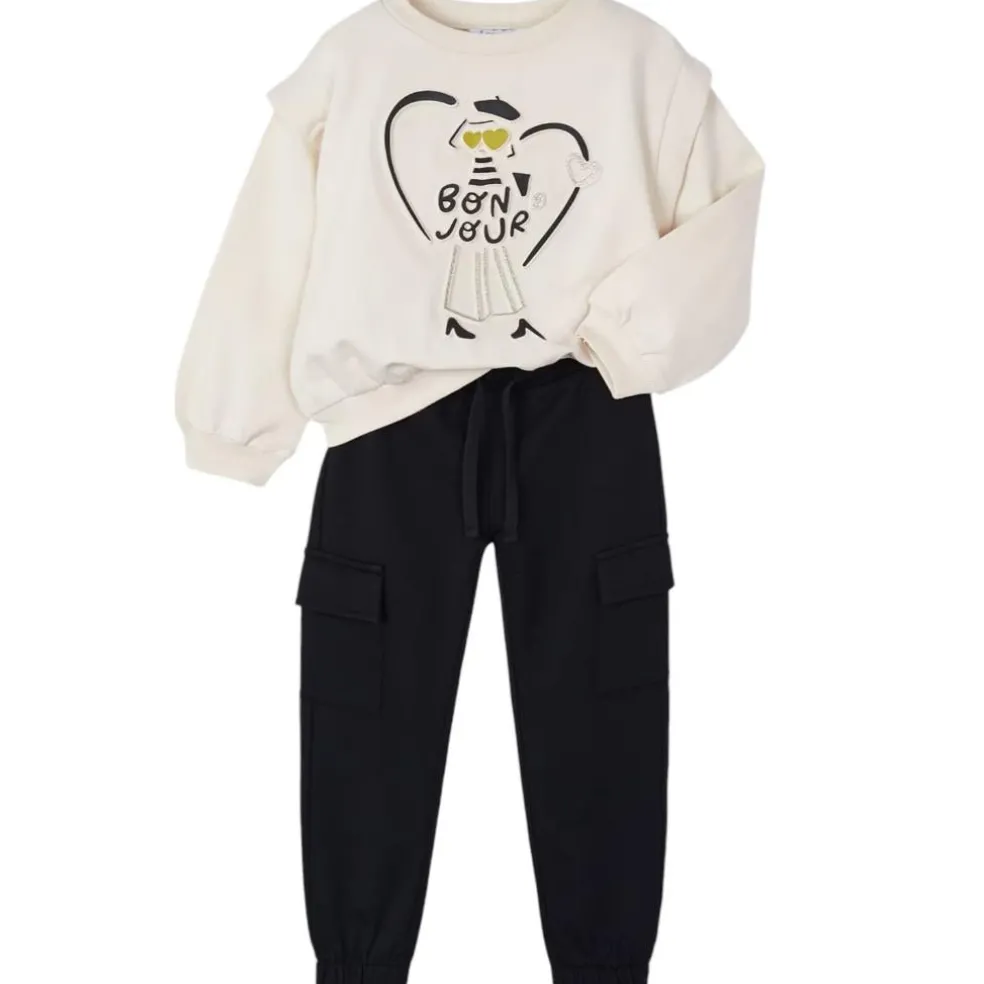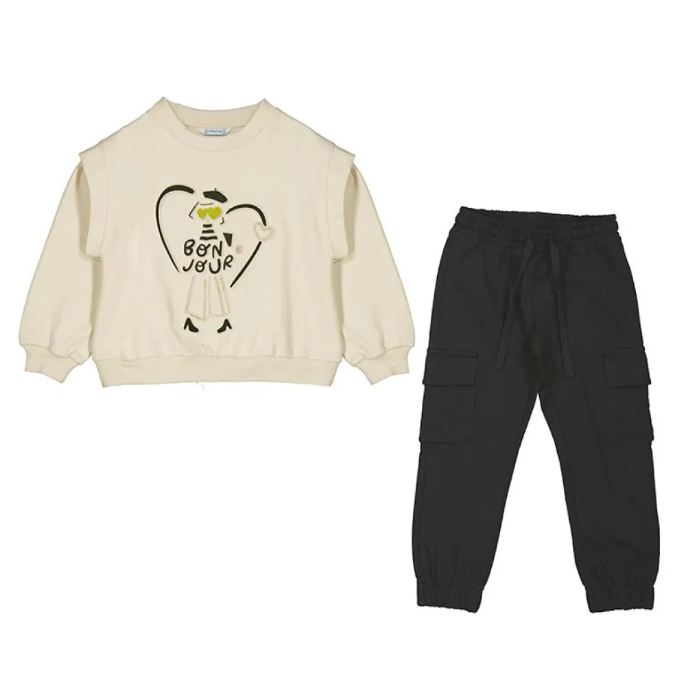 Long sleeved sweatshirt with an appliqued, printed design on the front and matching cargo style trousers with an elasticated drawstring waistband.