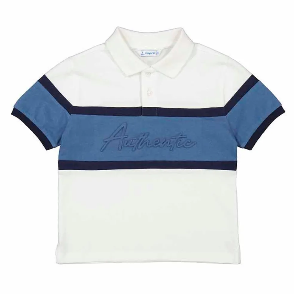 Short sleeved polo shirt which has a broad contrasting coloured stripe across the chest which is finished with an embossed ‘authentic’ design.
