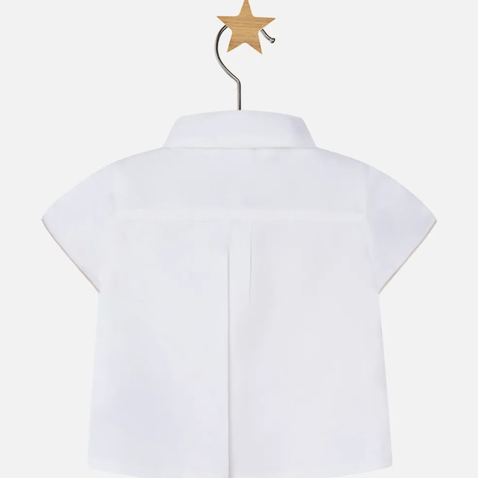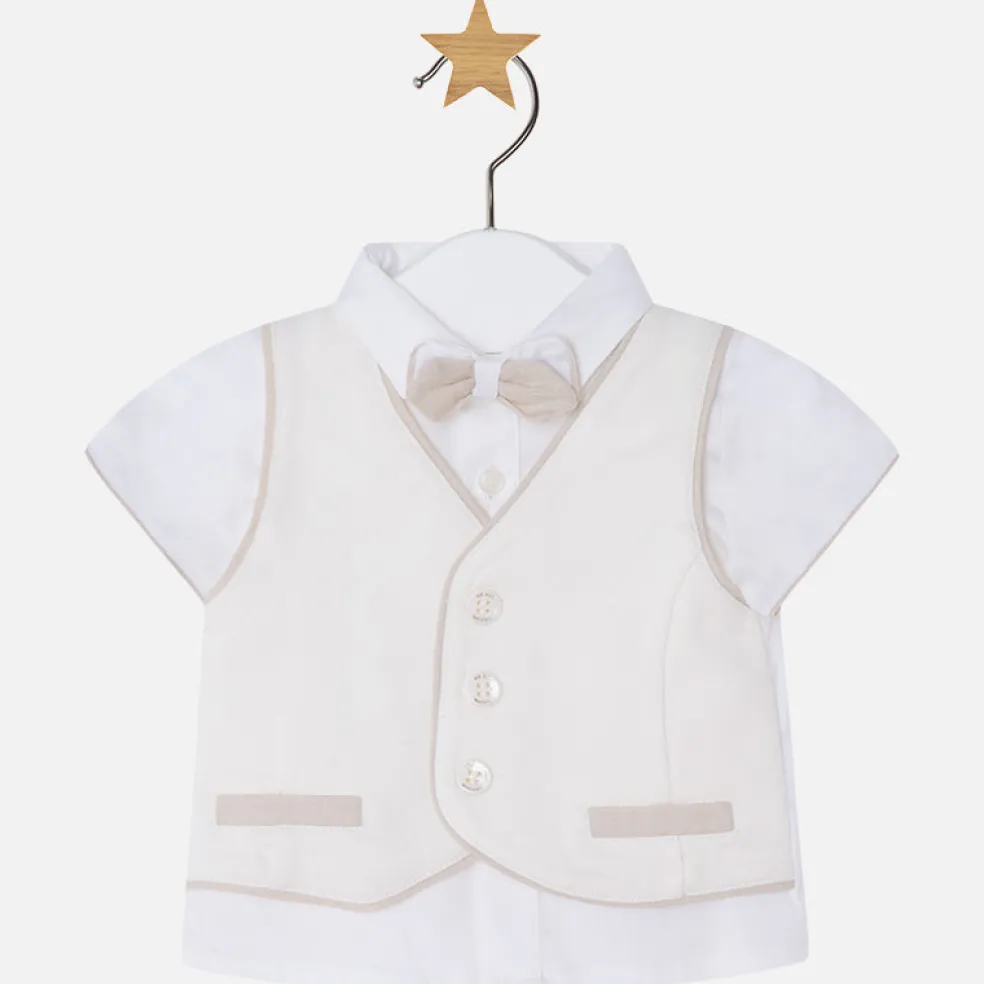 Set with short sleeve shirt, vest and bow tie, an ideal design for special occasions. Shirt is made of soft fabric poplin lycra and opening in buttons, bow tie elastic and adjustable, non-functional pocket on vest.