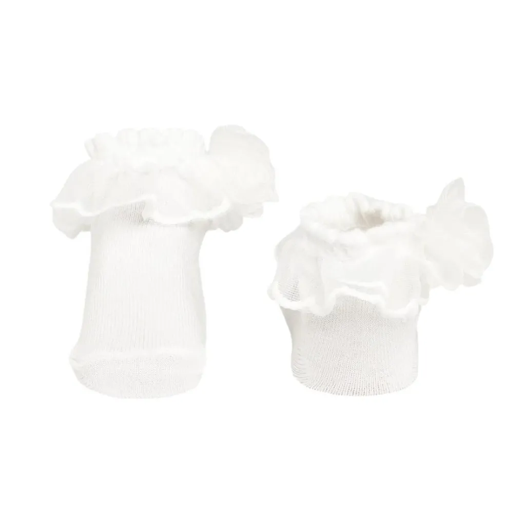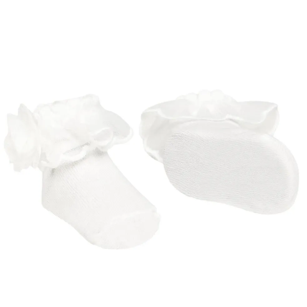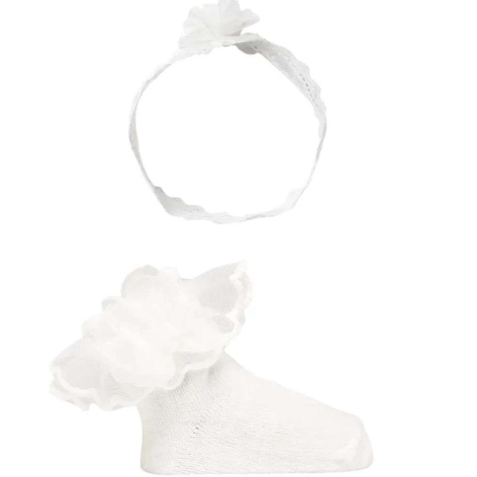 Ankle socks finished with a voile frill and an appliquéd flower, matching stretched lace headband finished with an appliquéd flower.