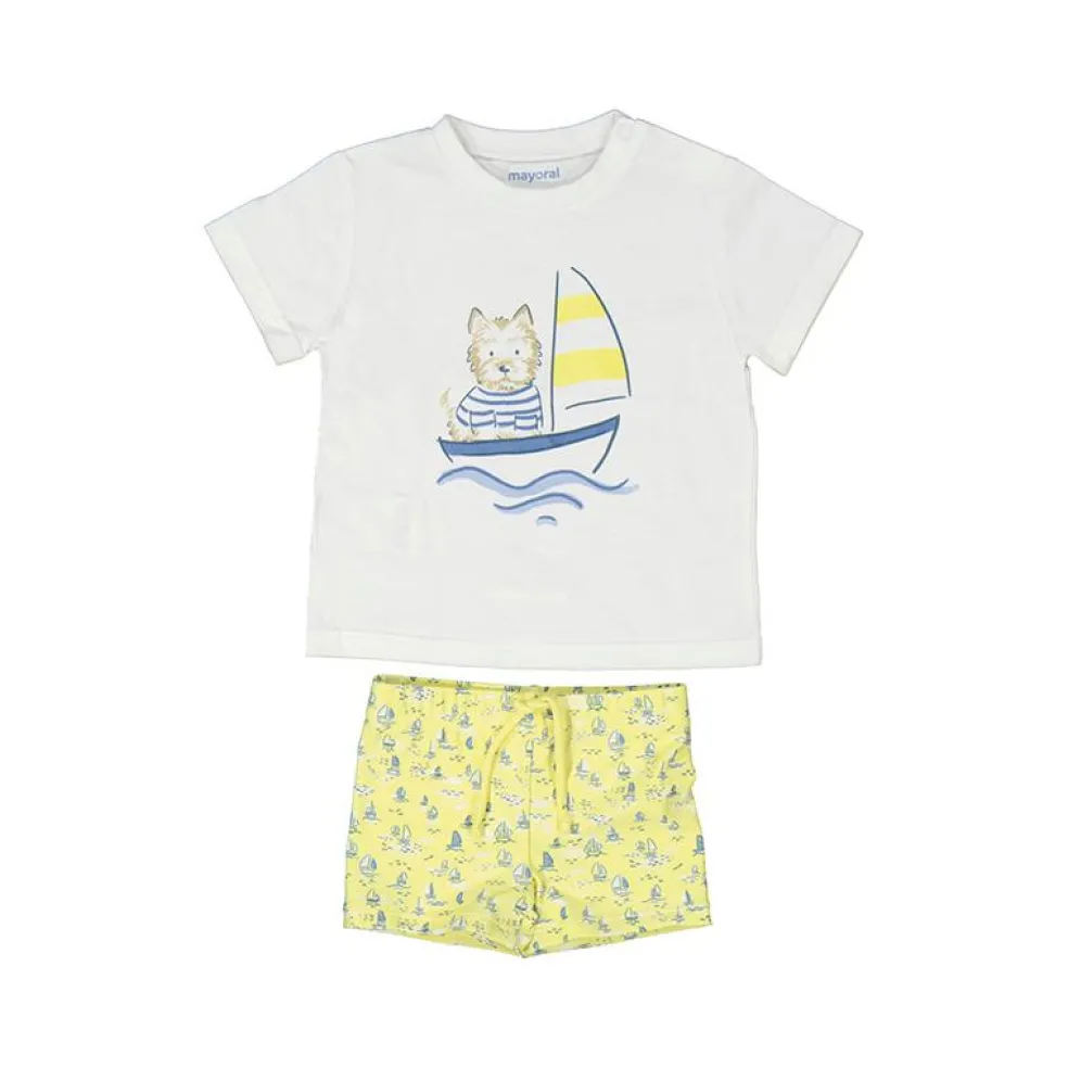 Short sleeve t shirt with a round neckline and a printed sail boat design on the front.
