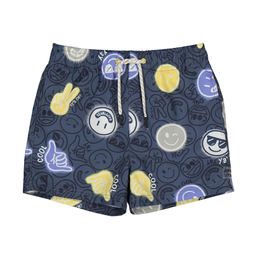 Lined swim shorts in a smiley face printed design with an elasticated waistband.