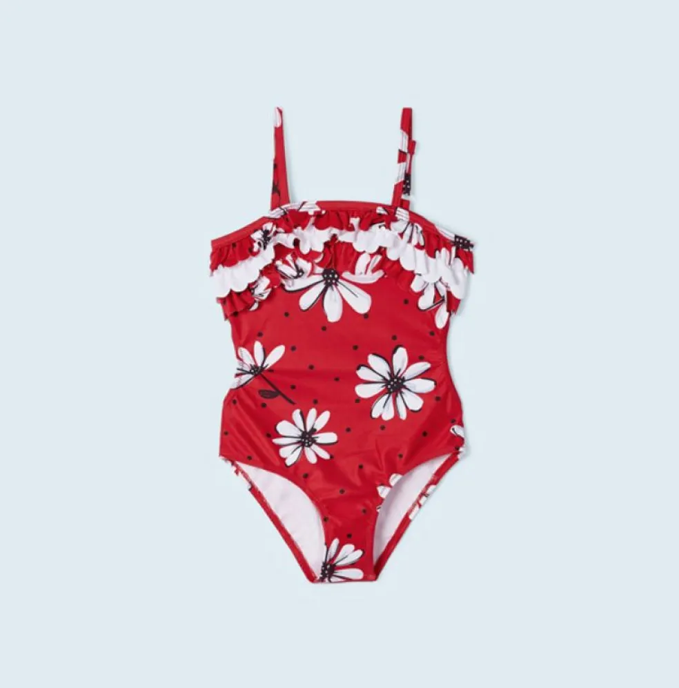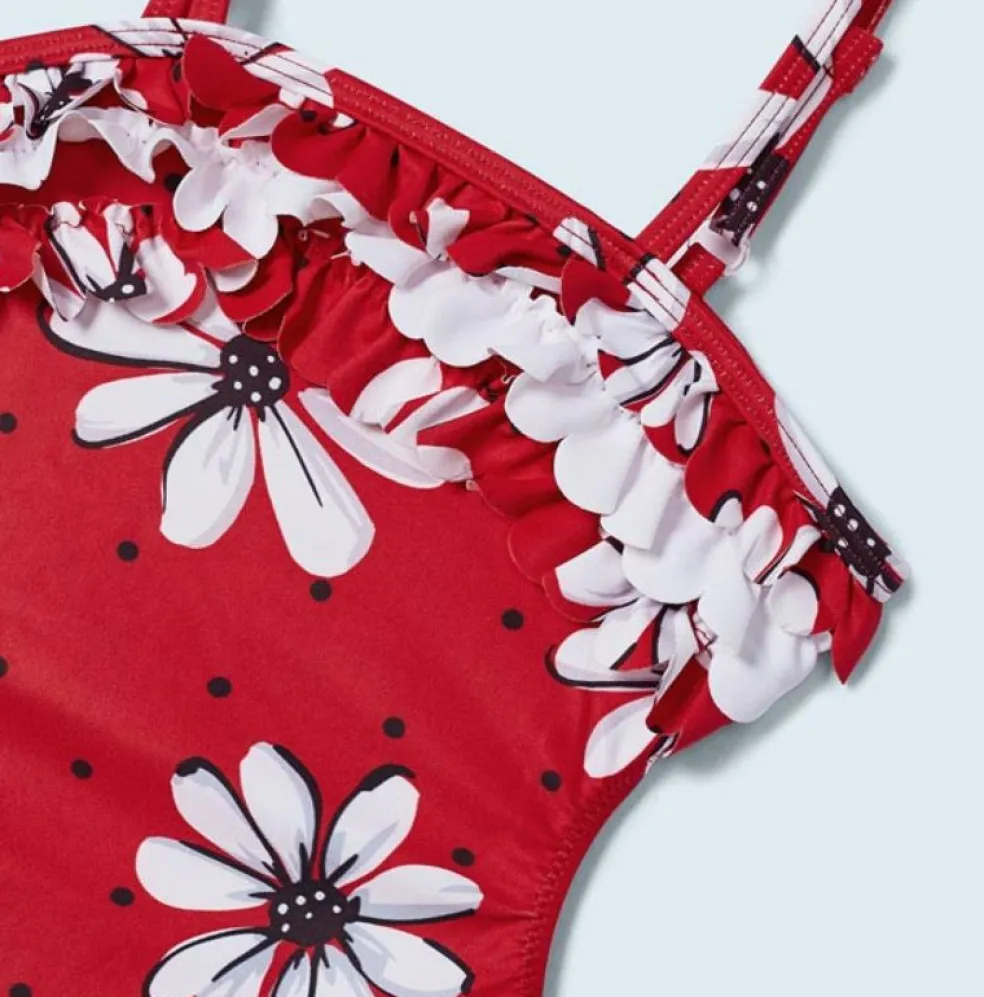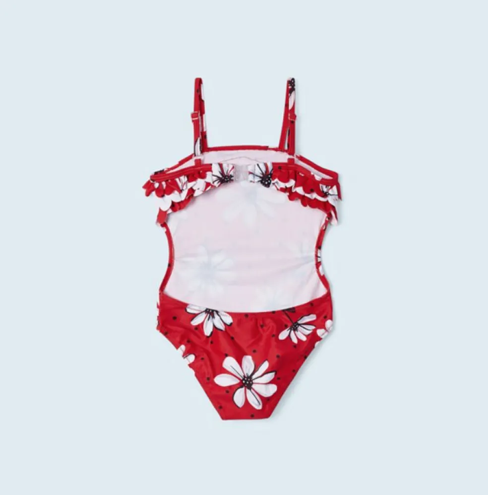 Swimming costume with a back fastener and cut out detailing, adjustable straps and finished with 3 ruffles across the chest.